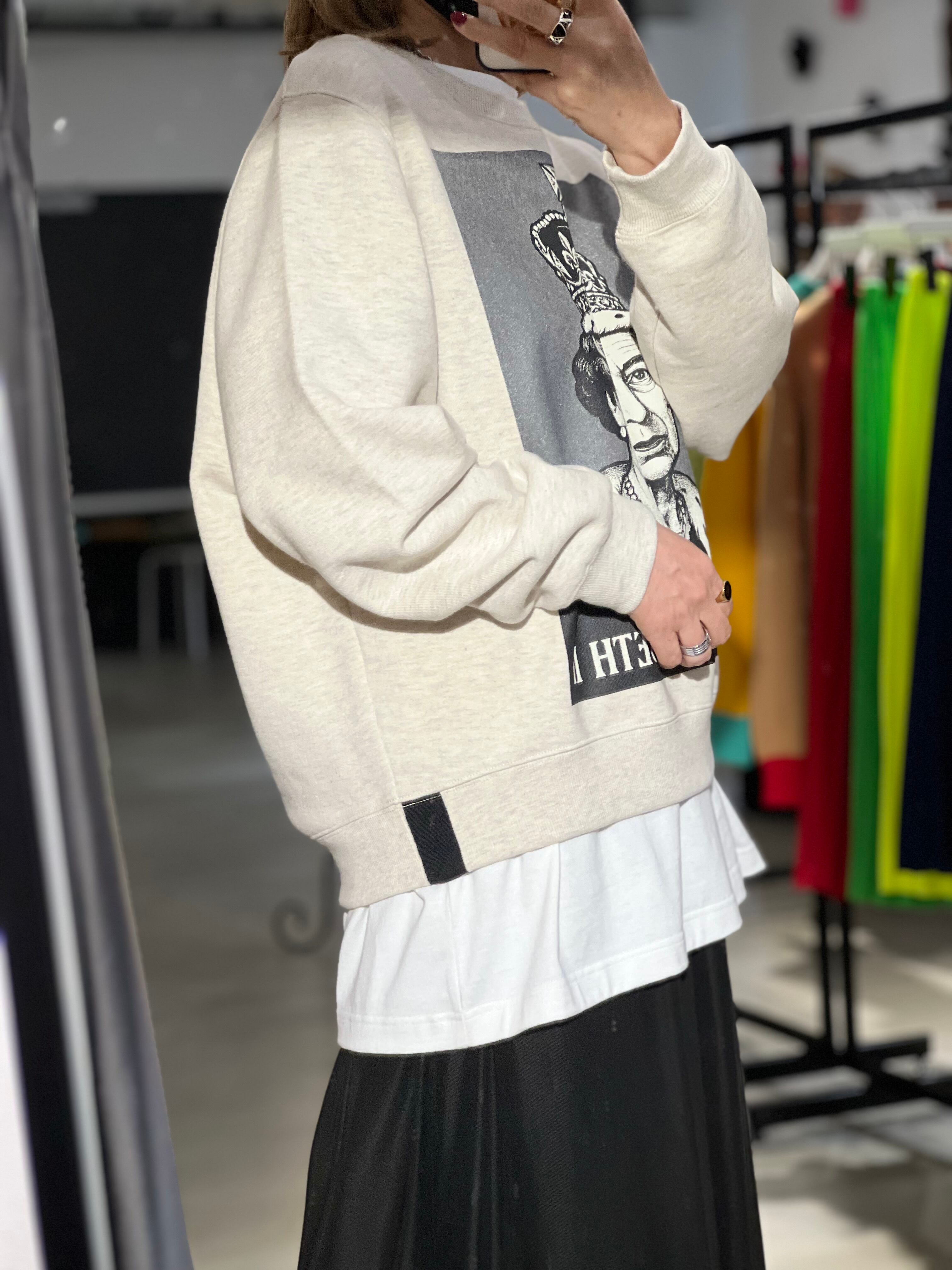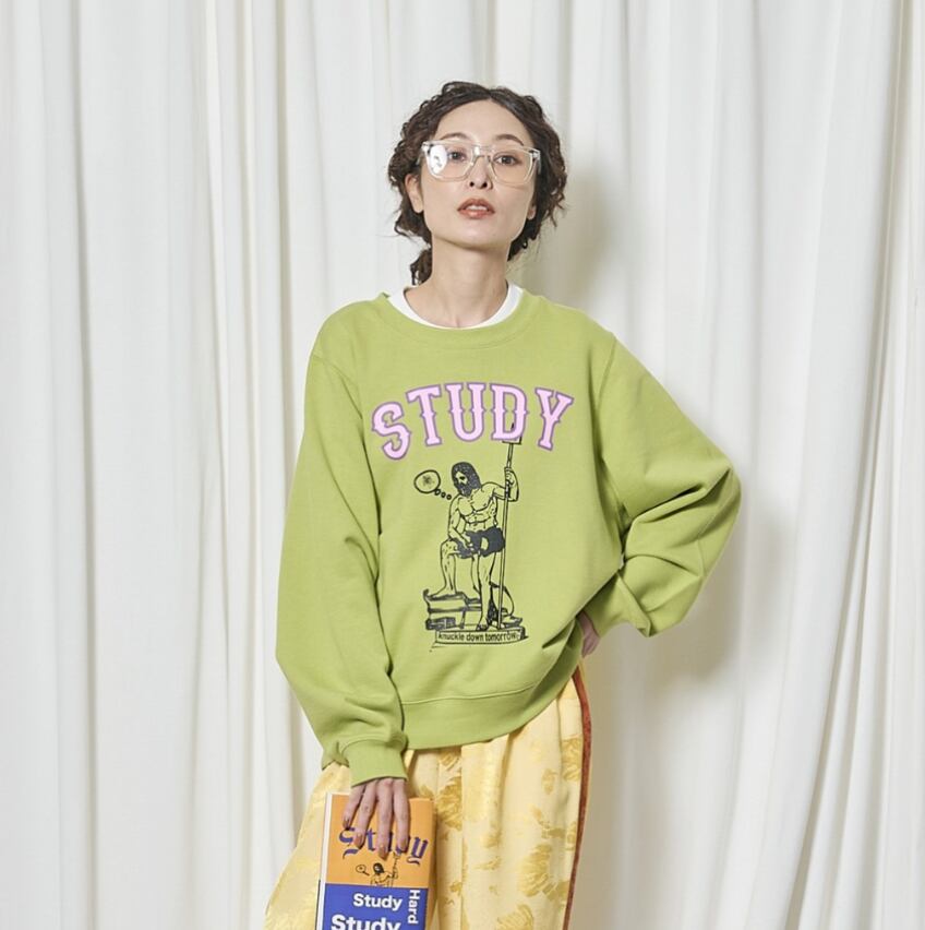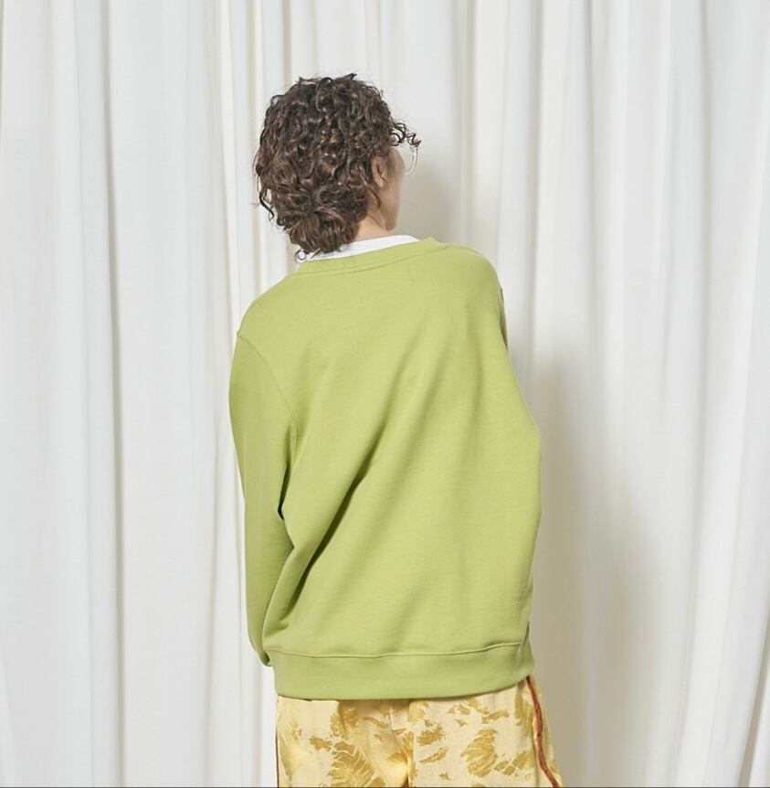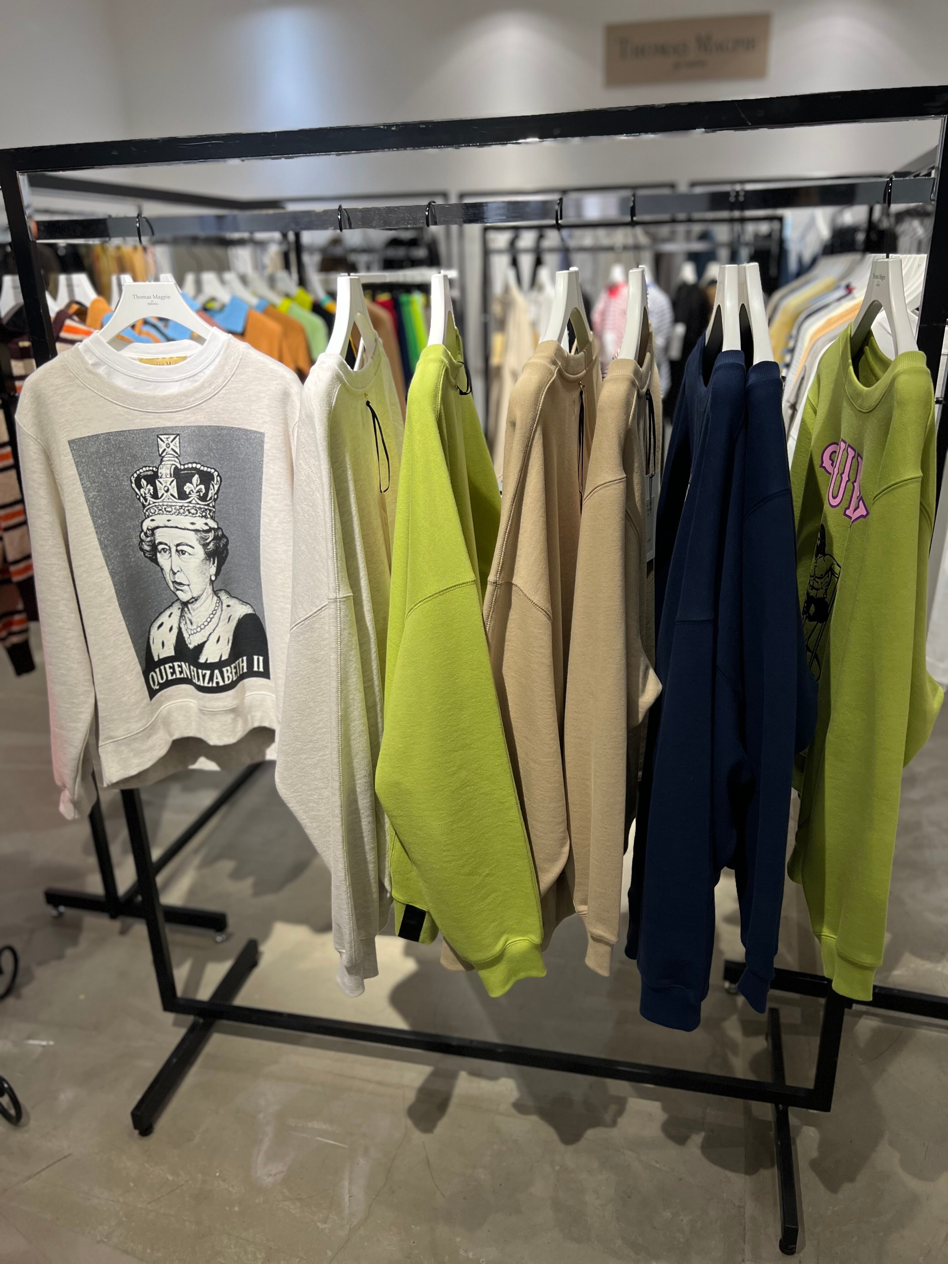 耐久性があり、長くずっと着る事ができる素材にしています。トーマスマグパイのスウェットは長年定評があり、コレクションのアイテムの中でも非常に人気の販売シェア率を誇っています。首周りは、今回、大きめ。インナーにTシャツや、襟付きのシャツなどを入れるとバランスが良くなります。私はクルーネックのスウェットには、シャツかTシャツを入れるのを好みます。これまで何度もビッグサイズ(メンズのXL程度)のサイズを数シーズン展開してきましたが、久しぶりにやや小さめビッグシルエットも着たくなり、リリースしました。
