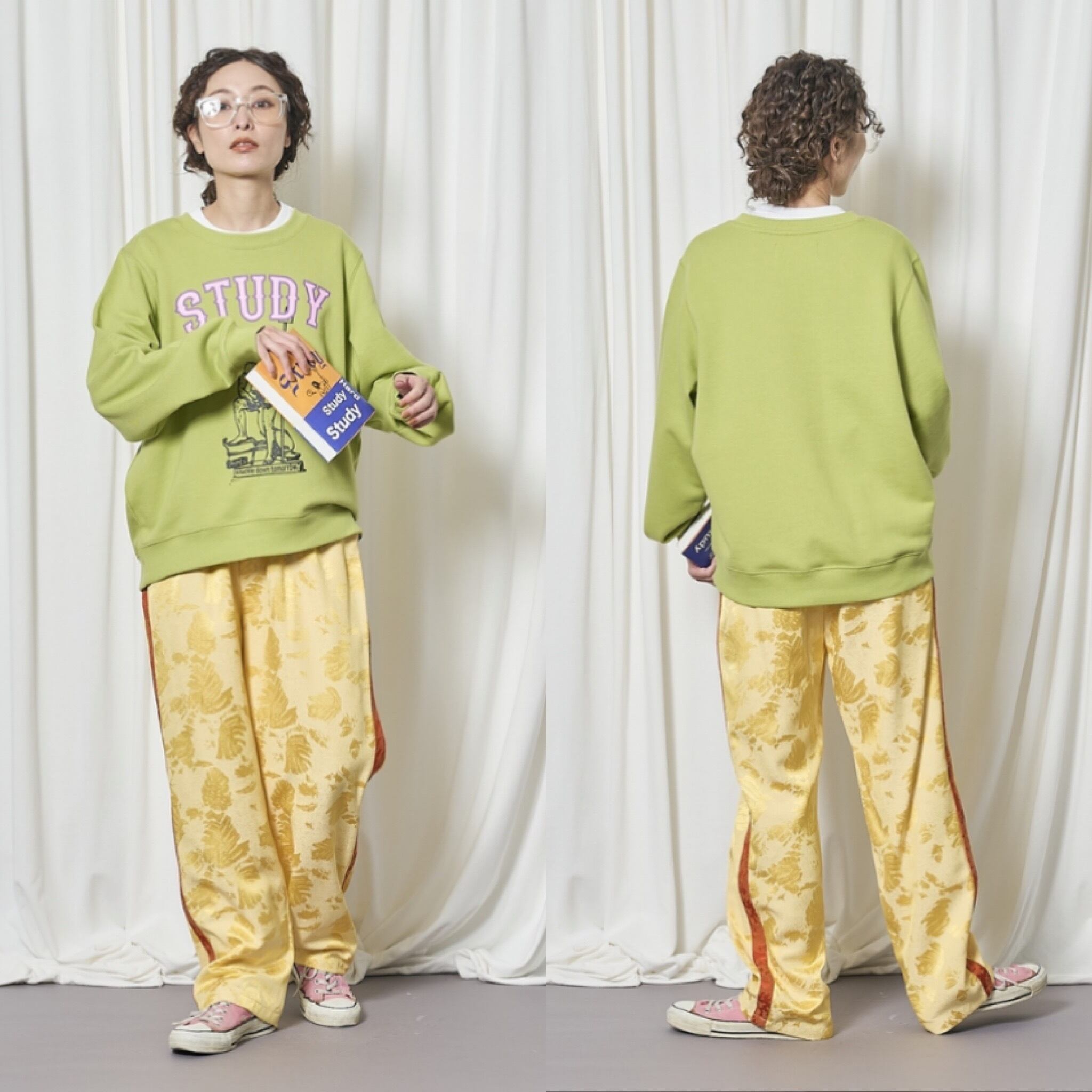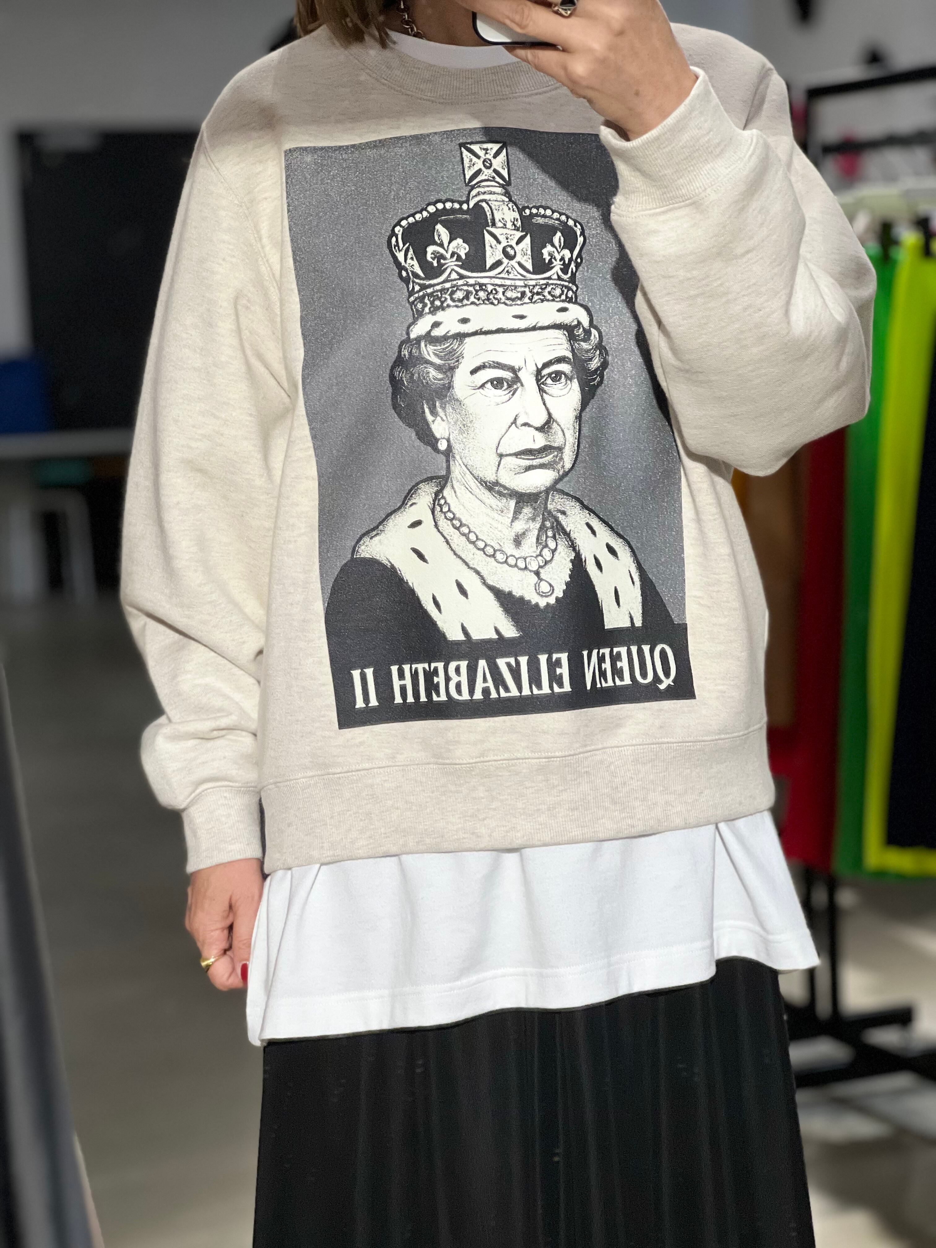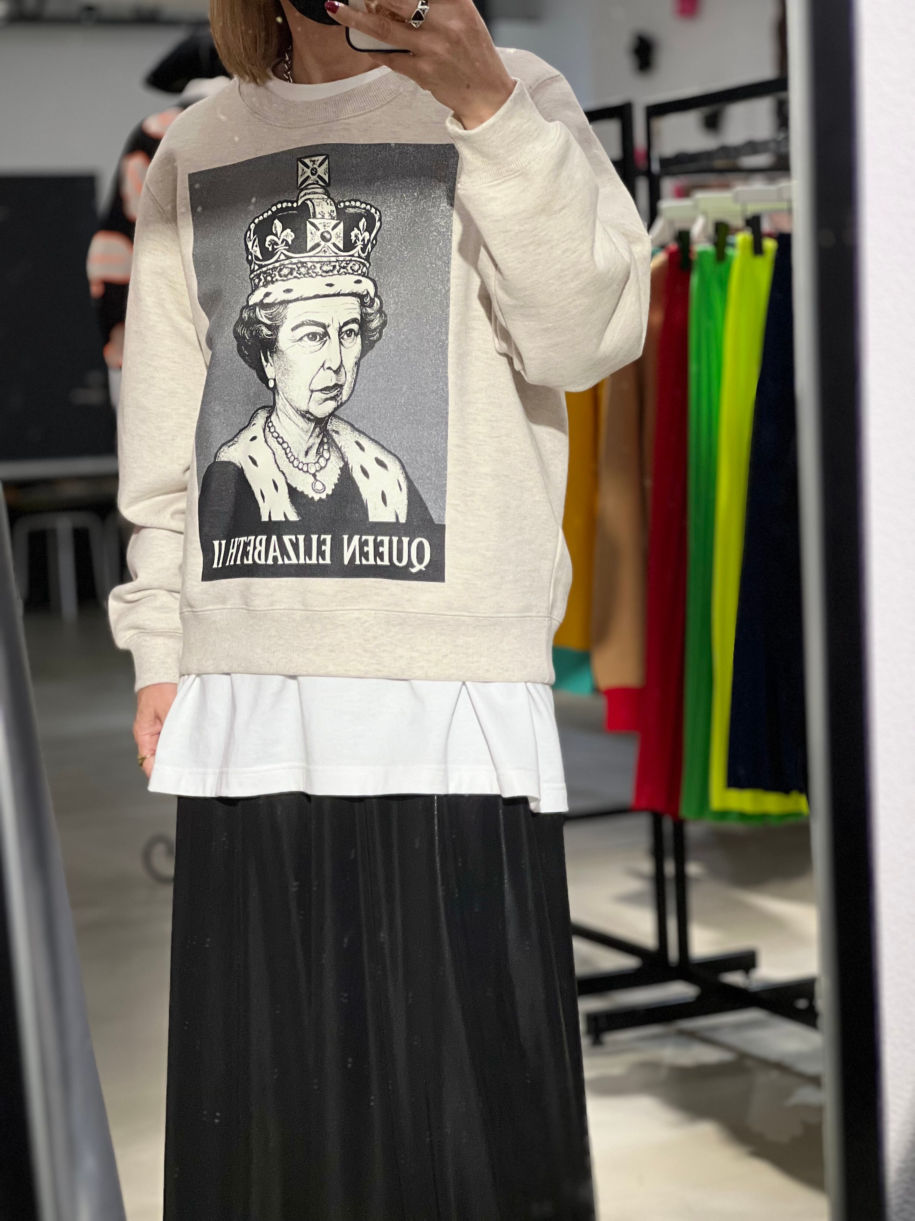 耐久性があり、長くずっと着る事ができる素材にしています。トーマスマグパイのスウェットは長年定評があり、コレクションのアイテムの中でも非常に人気の販売シェア率を誇っています。首周りは、今回、大きめ。インナーにTシャツや、襟付きのシャツなどを入れるとバランスが良くなります。私はクルーネックのスウェットには、シャツかTシャツを入れるのを好みます。これまで何度もビッグサイズ(メンズのXL程度)のサイズを数シーズン展開してきましたが、久しぶりにやや小さめビッグシルエットも着たくなり、リリースしました。