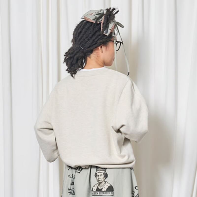 耐久性があり、長くずっと着る事ができる素材にしています。トーマスマグパイのスウェットは長年定評があり、コレクションのアイテムの中でも非常に人気の販売シェア率を誇っています。首周りは、今回、大きめ。インナーにTシャツや、襟付きのシャツなどを入れるとバランスが良くなります。私はクルーネックのスウェットには、シャツかTシャツを入れるのを好みます。これまで何度もビッグサイズ(メンズのXL程度)のサイズを数シーズン展開してきましたが、久しぶりにやや小さめビッグシルエットも着たくなり、リリースしました。