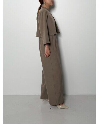 コンビネゾンは少しウエストの切り替えを上側に設定し、ショート丈のジャケットと合わせることでスタイルアップ効果を持たせました。