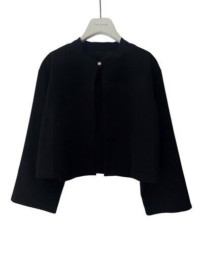 ショート丈のスタンドジャケットはスタンドカラーで少しマニッシュな印象にしつつ、後に大胆にいれたスリットで抜け感をプラス。