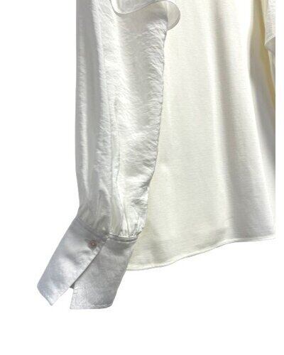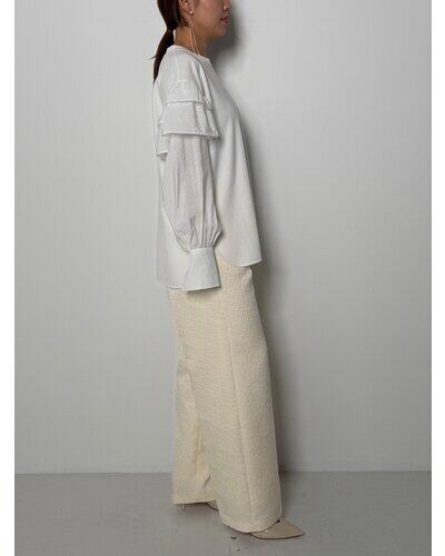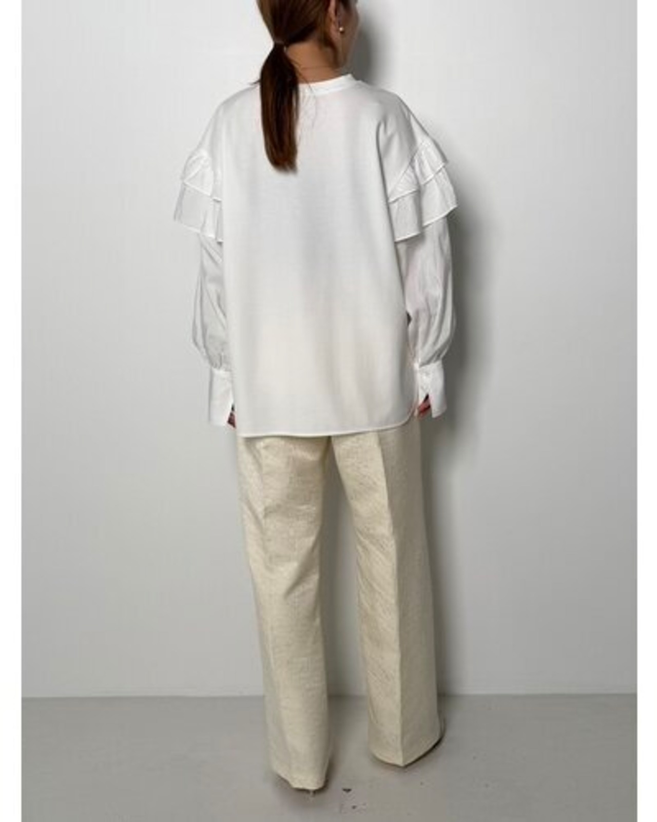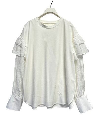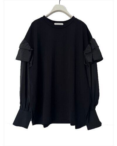 落ち感のある素材を使用した袖のフリルデザインは甘くなり過ぎず、シンプルなパンツやスカートを合わせるだけでスタイリングのポイントにしてくれます。