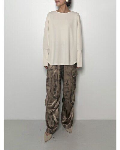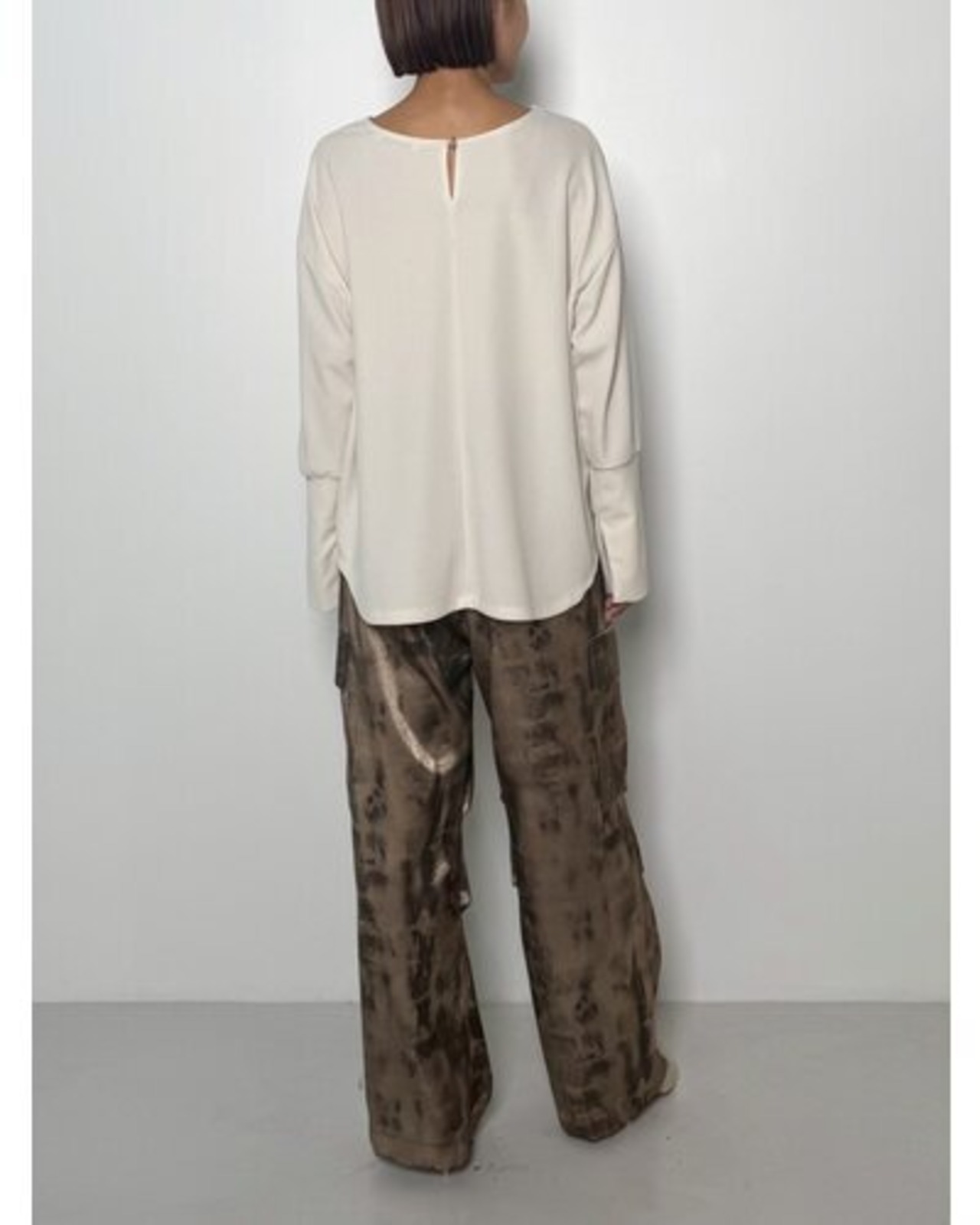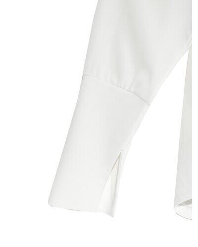 スリットデザインが施された長めのカフスデザインは、シンプルながら着こなしのポイントになります。後ろネックに付けた、ゴールドの華奢なバーボタンもアクセントになっています。