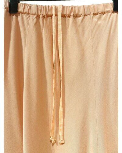 女性らしいアイテムにあえて加工を施し、CHIGNONらしくカジュアルに仕上げました。生地を贅沢にたっぷりと使い、裾まわりにボリュームが生まれる綺麗なシルエットに拘りました。歩く度に裾の生地がきれいに揺れる、着映えするアイテムです。ウエストはゴムとテープ入りのイージー仕様で、裾には短めのスリットがあるデザインです。