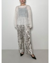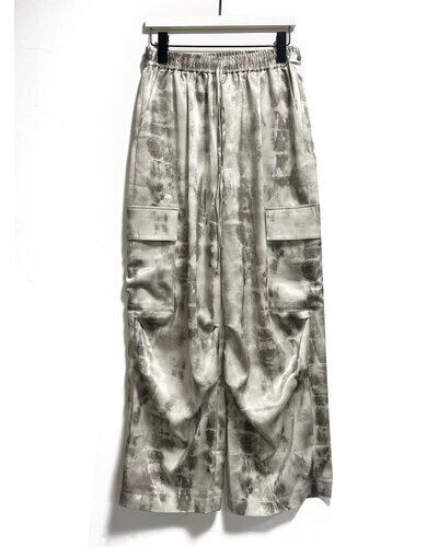 サテンに大理石のようなぼかしプリントが入ったカーゴパンツです。