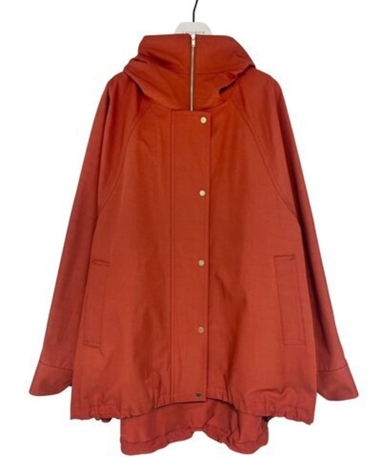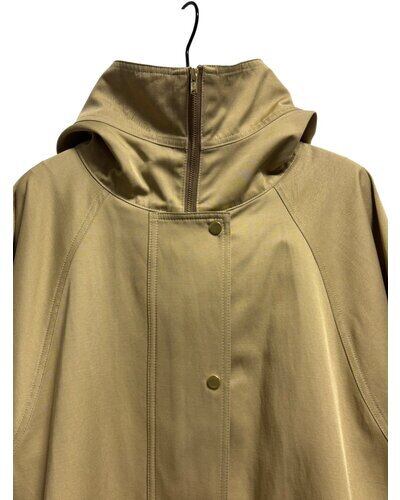 高めのスタンドフードがポイントのミディ丈のライトアウターです。