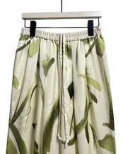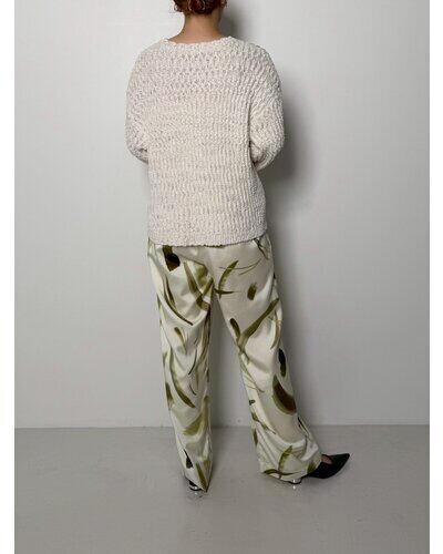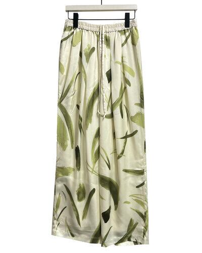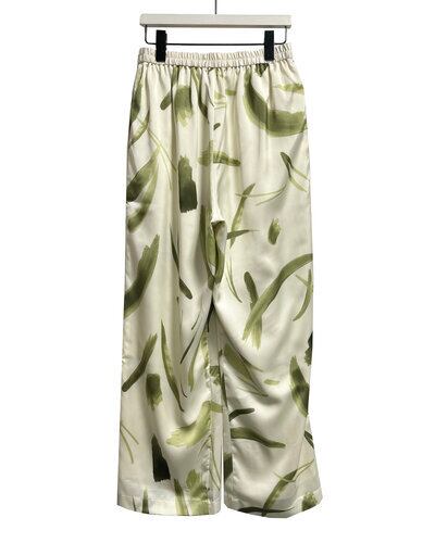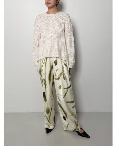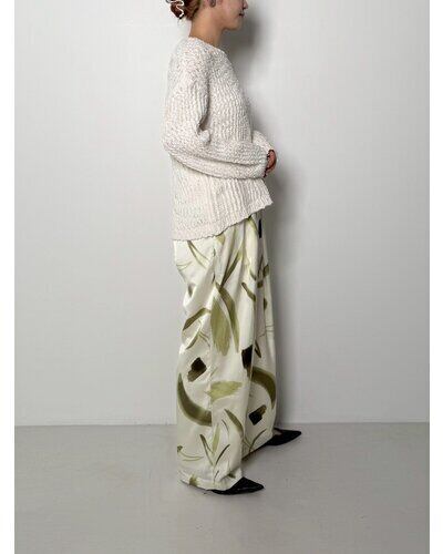 手書き風の大判な抽象柄が目を引く、サテンタックパンツです。
