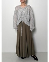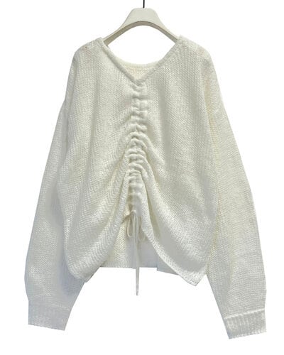 前後着用使用で、前はVネック、中央にドローストリングのデザインを入れ紐の調節でスタイリングに変化をもたらしてくれ、後ろはシンプルなUネックでシンプルにこなれ感を演出。