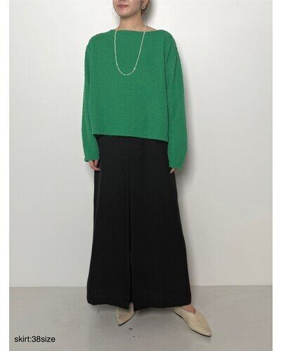 衿はボートネックで、下着が見えにくいネックサイズになっております。ゆったりとしたボックスシルエットですが、着丈はコンパクトなので、パンツ合わせでもスカート合わせでもコーディネートしやすいです。
