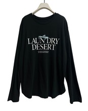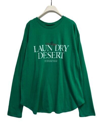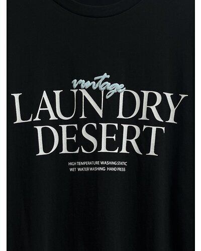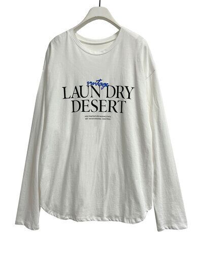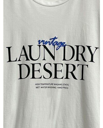 「vintage」は筆記体風の発泡プリントでアクセントに、下部には「HIGH TEMPERATURE WASHING STATIC」「WET WATER WASHING HAND PRESS」などのユーモラスな洗濯用語がプリントされており、ユニークな雰囲気を演出。