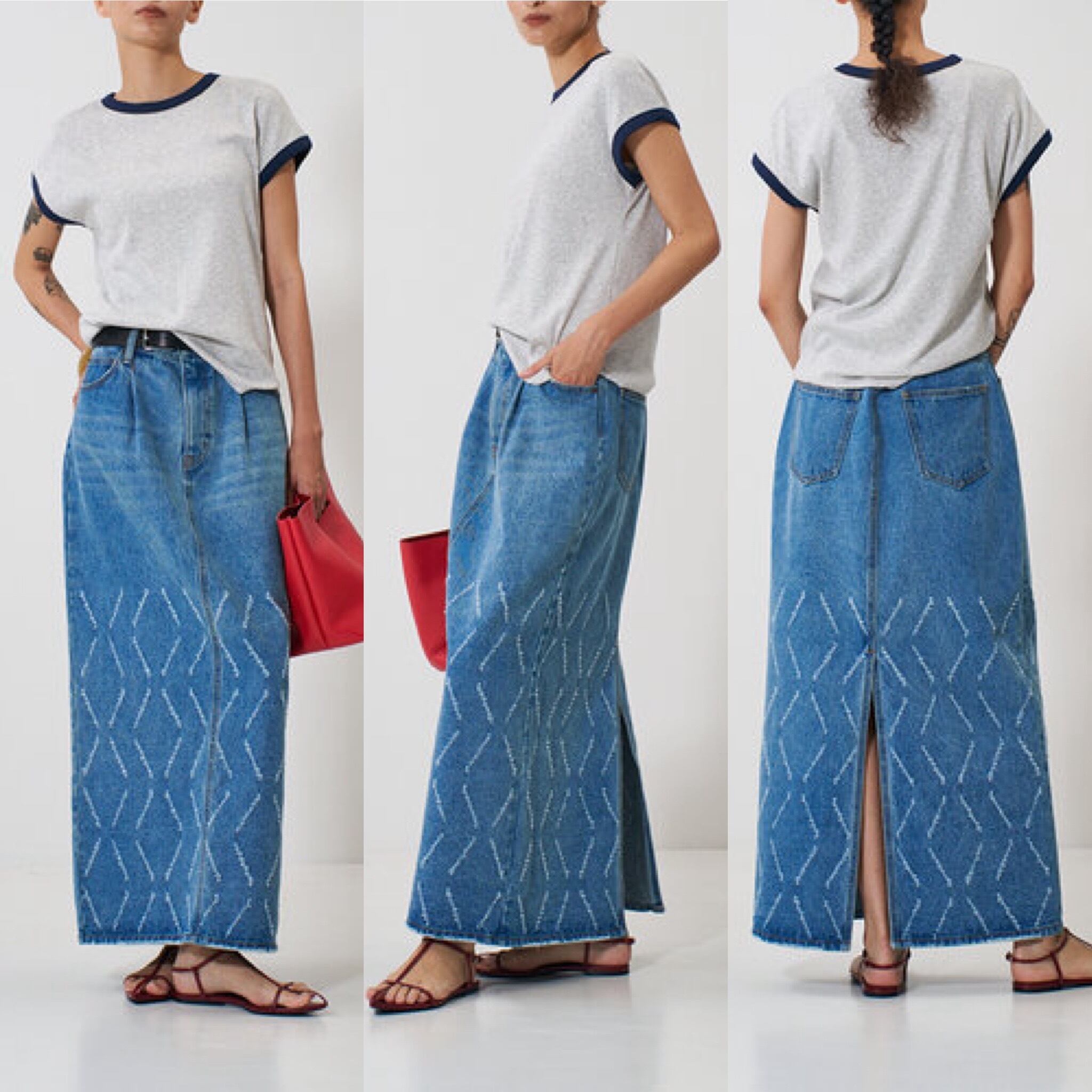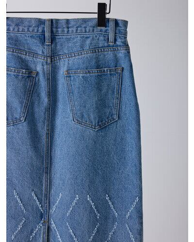 レーザー加工で表現するオリジナルパターンが特徴のデニムナロースカートです。