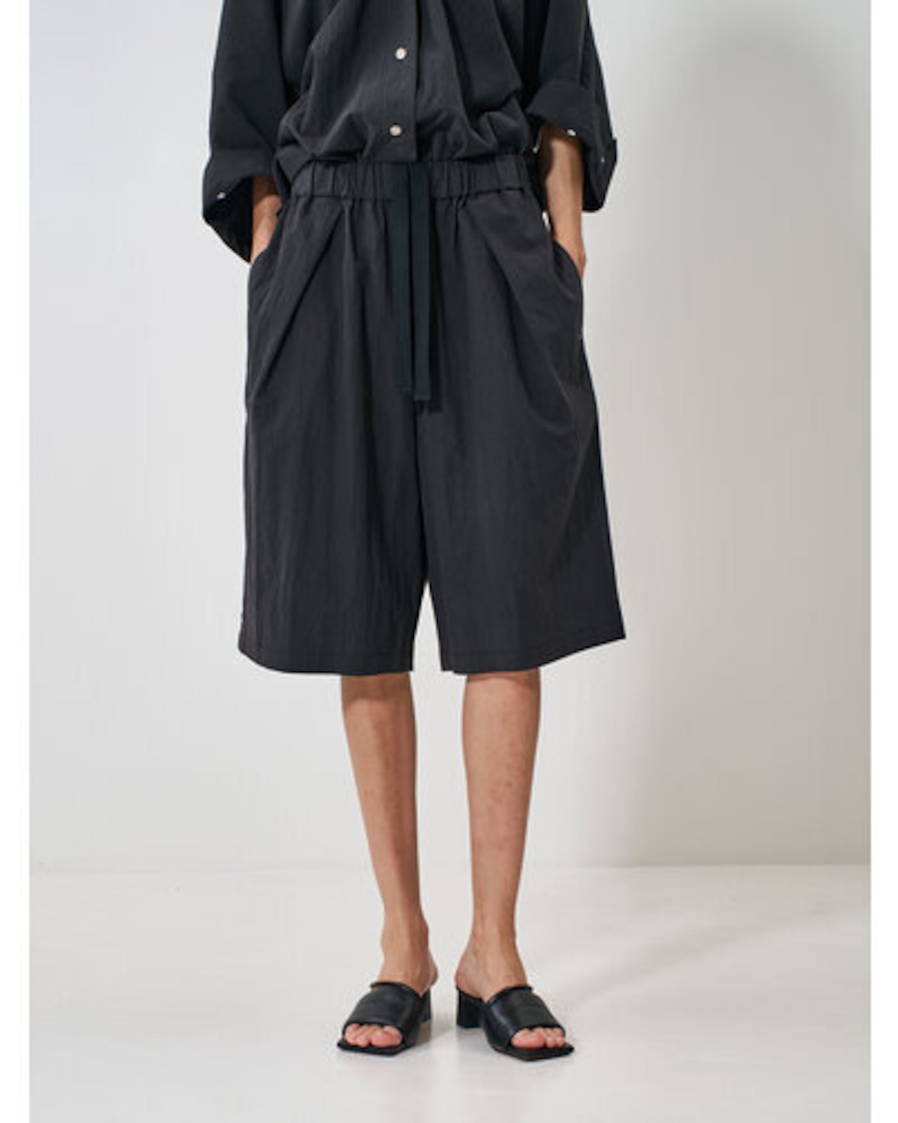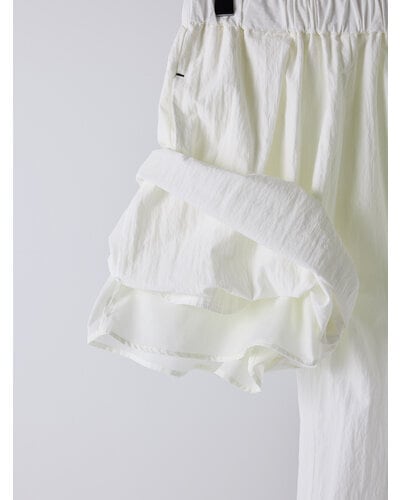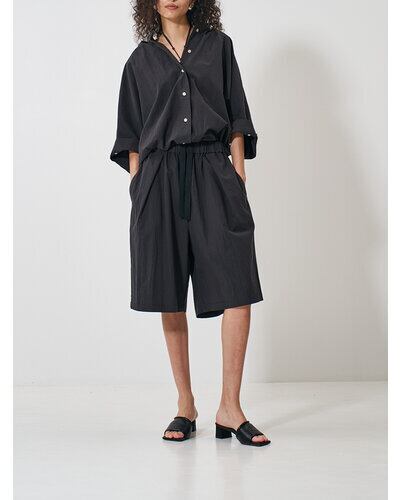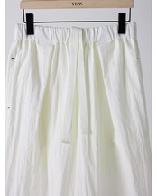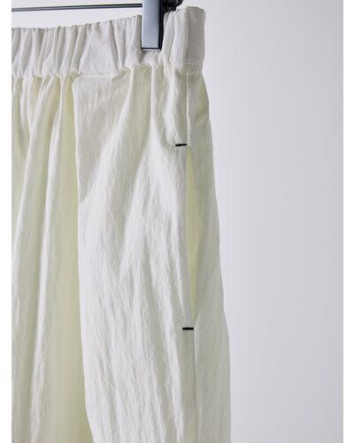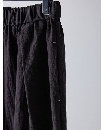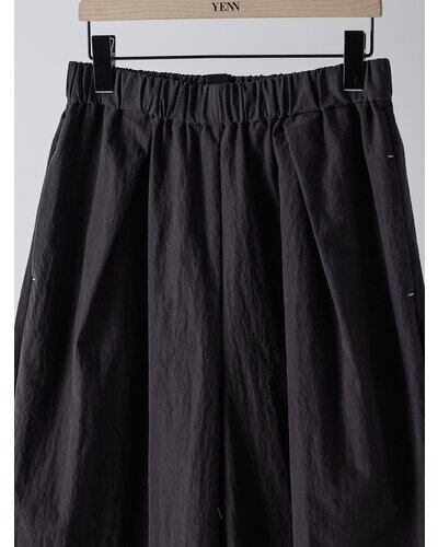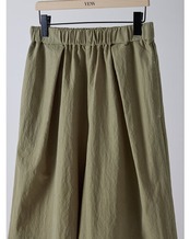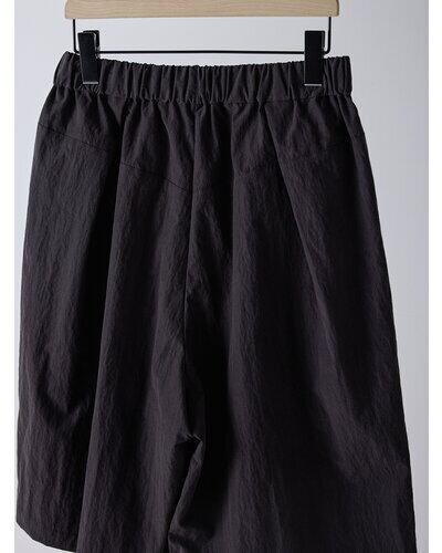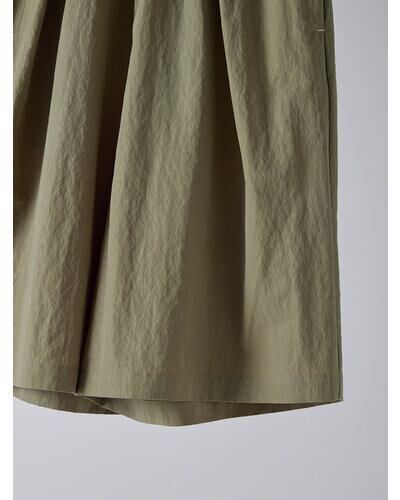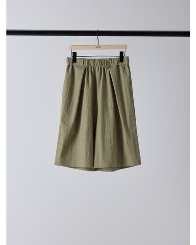 前後に深く入れたタックデザインで作るふんわりとしたシルエットがポイントで、ボーイッシュになりがちなアイテムに女性らしさをプラスしました。ウエストゴムのリラックス感のある仕立てで、ベルト裏の紐で絞って着用いただけます。