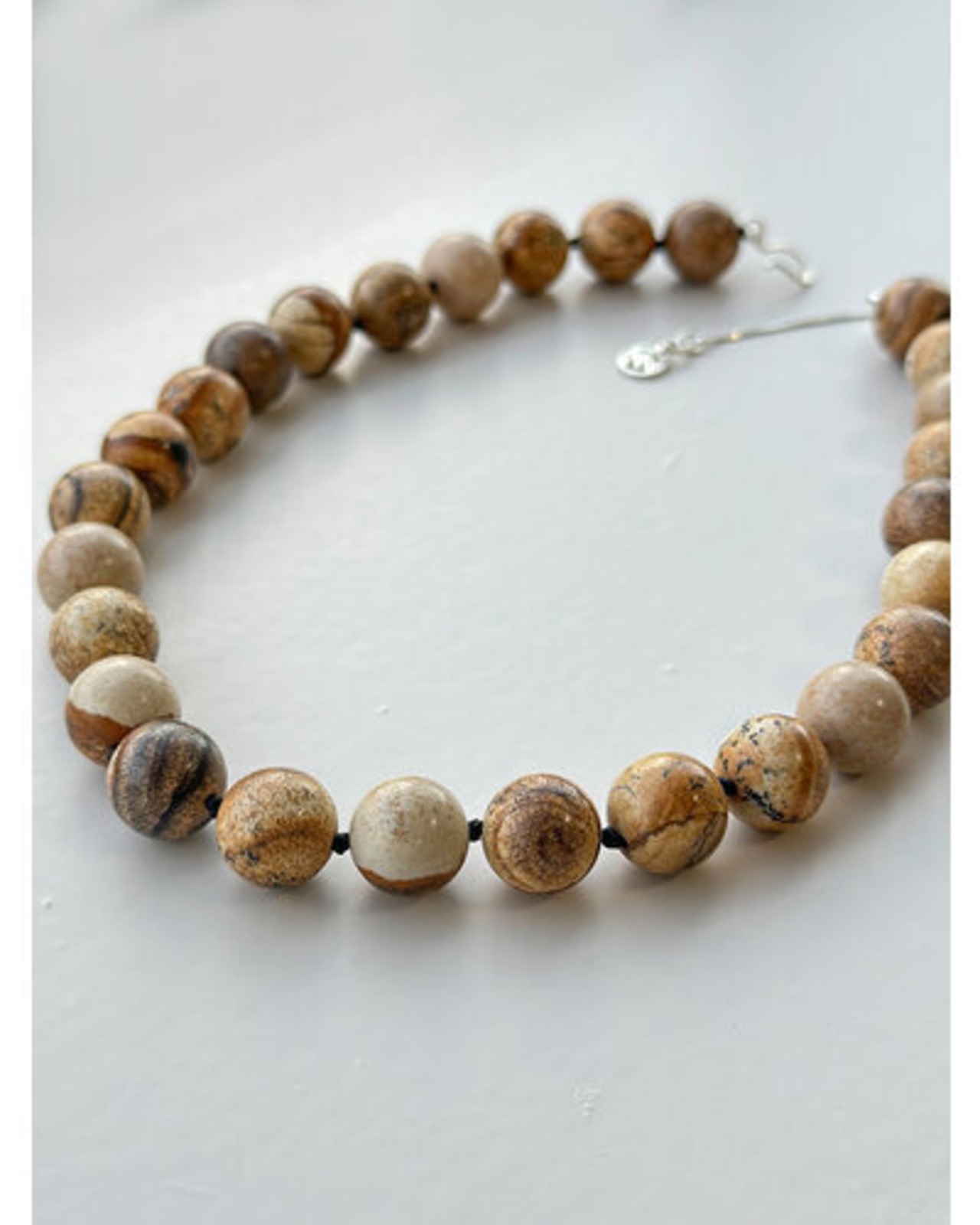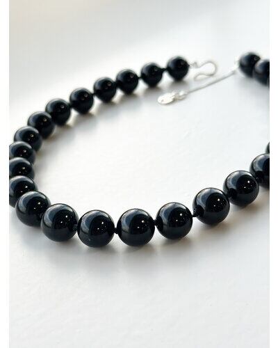 丸玉天然石を贅沢に使用したネックレスは、金具を全てSV925素材を使っているのでより上質な印象に。石と石の間には黒紐の結び目をポイントにしてクラフト感を出しています。存在感のあるやや大きめの12mm丸玉ネックレスは、カジュアルな装いにも馴染みやすく、付けるだけでいつものスタイリングにアクセントを加えてくれる一本です。長さは2段階調節可能(アジャスター2cm)、フックとチャームはYENNオリジナルパーツとなっております。天然石は天然素材の為、一つ一つ色味やサイズに若干の個体差が生じます。予めご了承下さい。