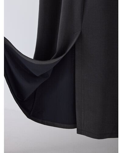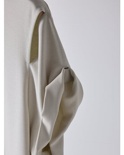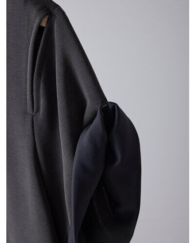 肩にはさりげなくアイレットあきを入れ、動いた時にチラッと肌がのぞく上品な抜け感をプラス。袖口はねじりを効かせたロールアップデザインで、立体感とモダンな表情を添えています。後ろ中心にはベンツあきを取り入れ、歩くたびにしなやかな揺れ感を演出。さらに配色のカンヌキを随所に施し、細部にまでこだわりを感じさせるデザインポイントになっています。