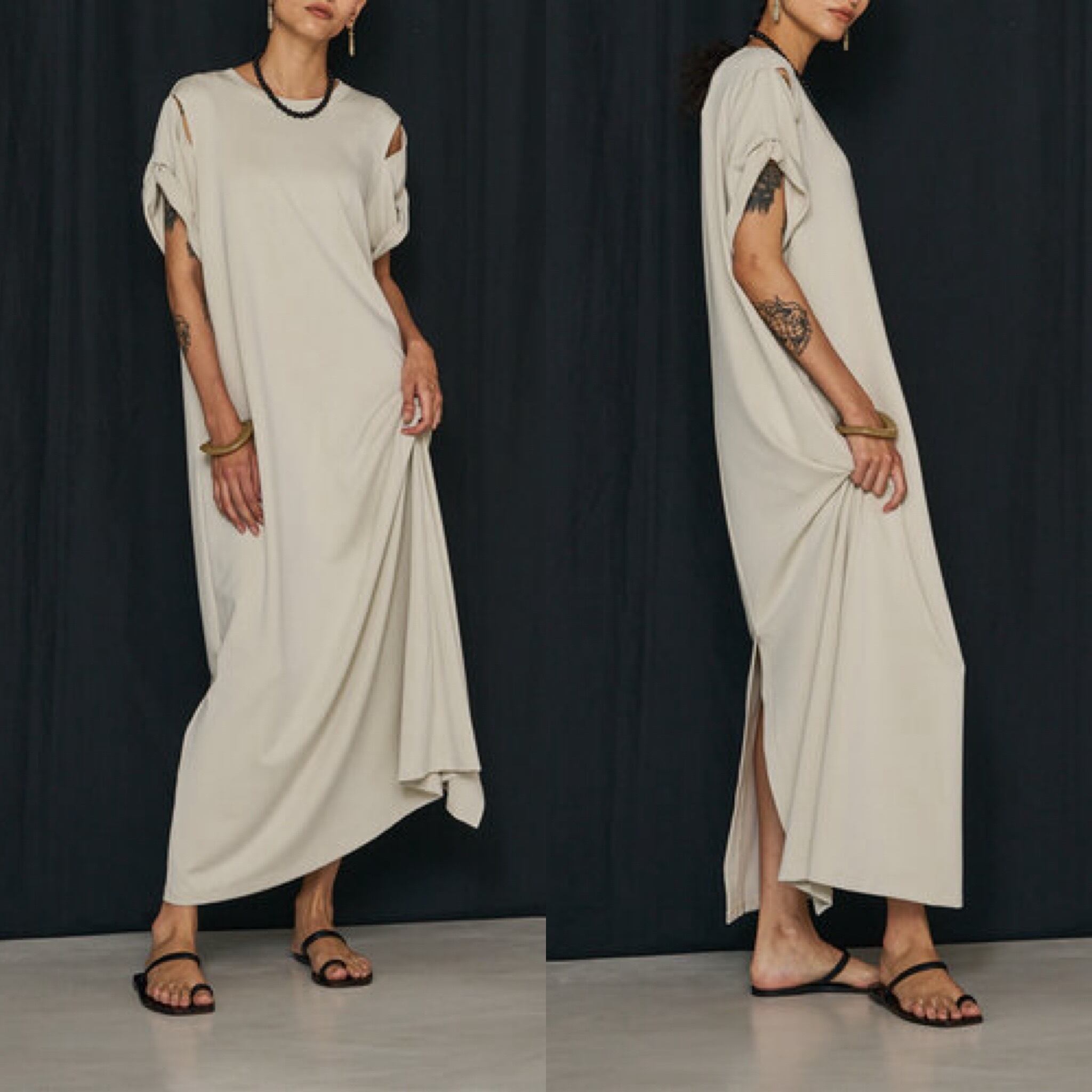 フィブリル加工のダブルジャージー生地で仕立てたTEEワンピースです。