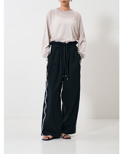 袖口には光沢のある別素材を組み合わせ、上品さと華やかさをプラス。異素材のコントラストが全体を引き締め、さりげないデザインポイントになっています。ラグランスリーブならではのリラックス感のあるシルエットで、肩まわりをやさしく見せつつ、抜け感のある大人のスタイルに仕上げました。