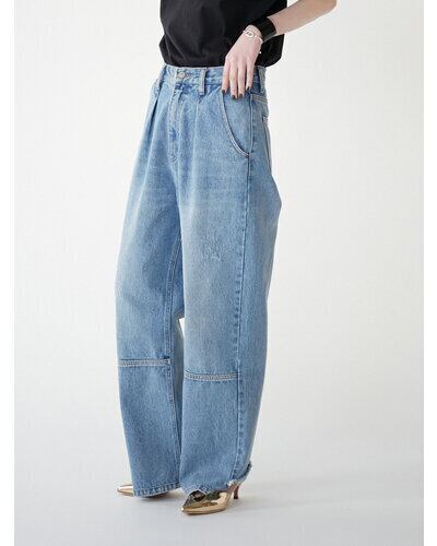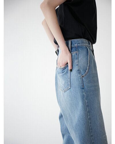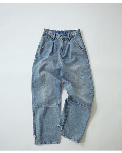 膝下にいれた切り替えデザインや、ところどことに施したさりげないダメージ加工など、こだわりのつまった1枚です。