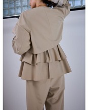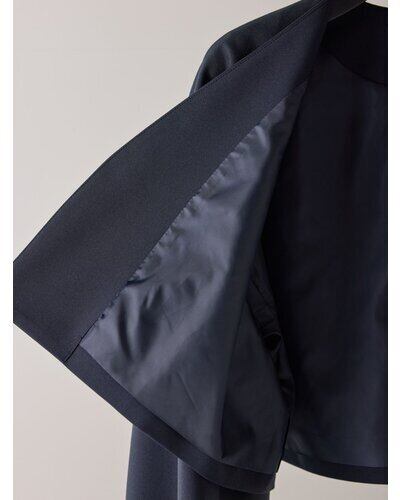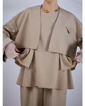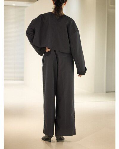 すっきりノーカラーで仕上げたボレロジャケットは、バストや肩幅にゆとりを持たせた設計で、着るだけでモードなバランスが手に入る一枚。
