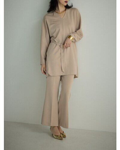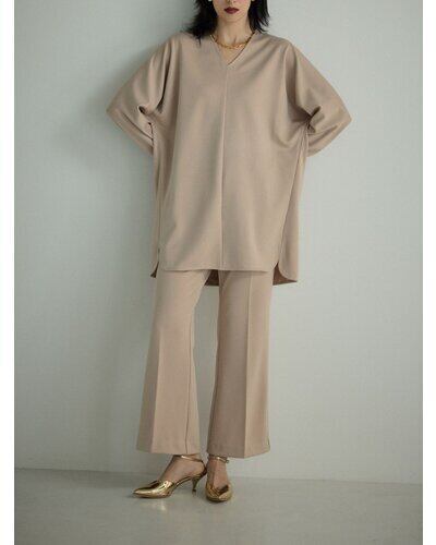 同素材のフレアパンツと合わせると、ラクなのにきれい見えするセットアップに。