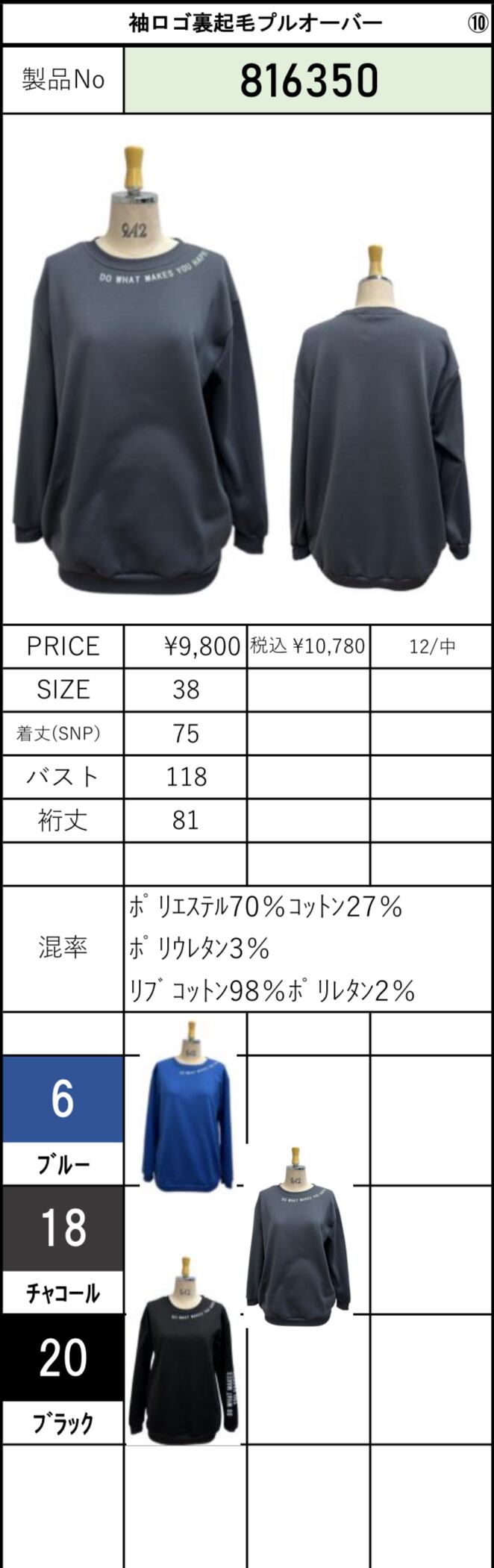 メーカー受注書に記載されている、デザイナー指示のサイズ・カラー表記を掲載しております。