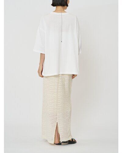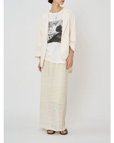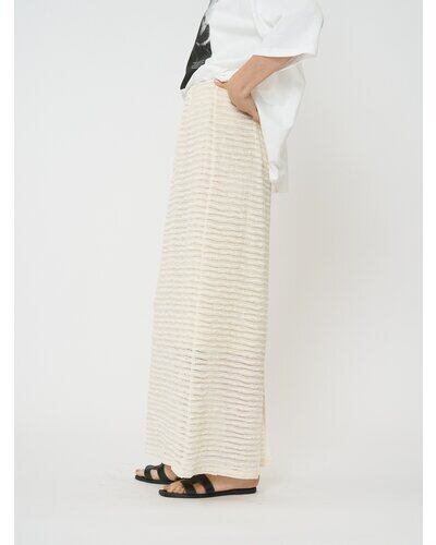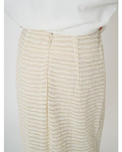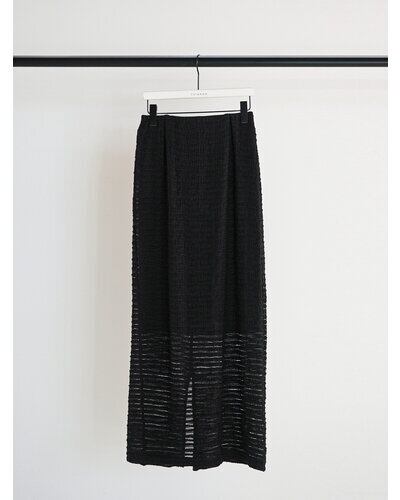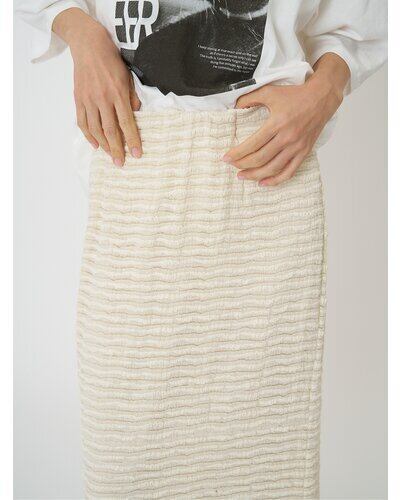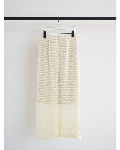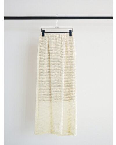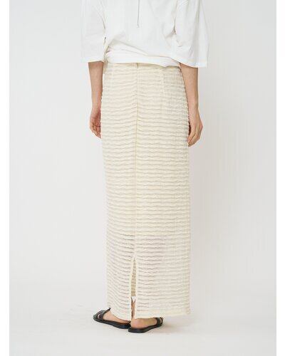 クラフト感のあるジャカードレースを横づかいし、ボーダー調の畝が効いたストレッチ性の高いレーススカートに仕立てました。伸びの良い生地で動きやすく、スタイルアップ効果も抜群。足元の透け感が軽やかで、シンプルなスタイリングに華やかさをプラスしてくれます。