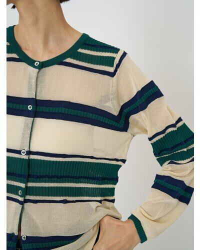 シャリ感のあるシアーな糸と、微光沢のある二種類の糸を組み合わせて作ったニットカーディガン。