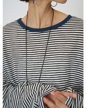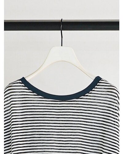 以前ご好評を頂いておりましたシアーボーダーカットソーをリバイバル。配色の衿がトレンド感を増し、さらに”今っぽい”1枚に仕上がりました。程よいシャリみと透け感がスタイリングに軽さを出し、春ムード全開に。