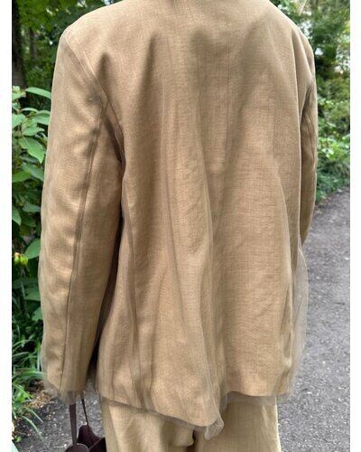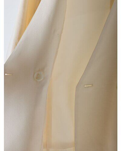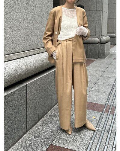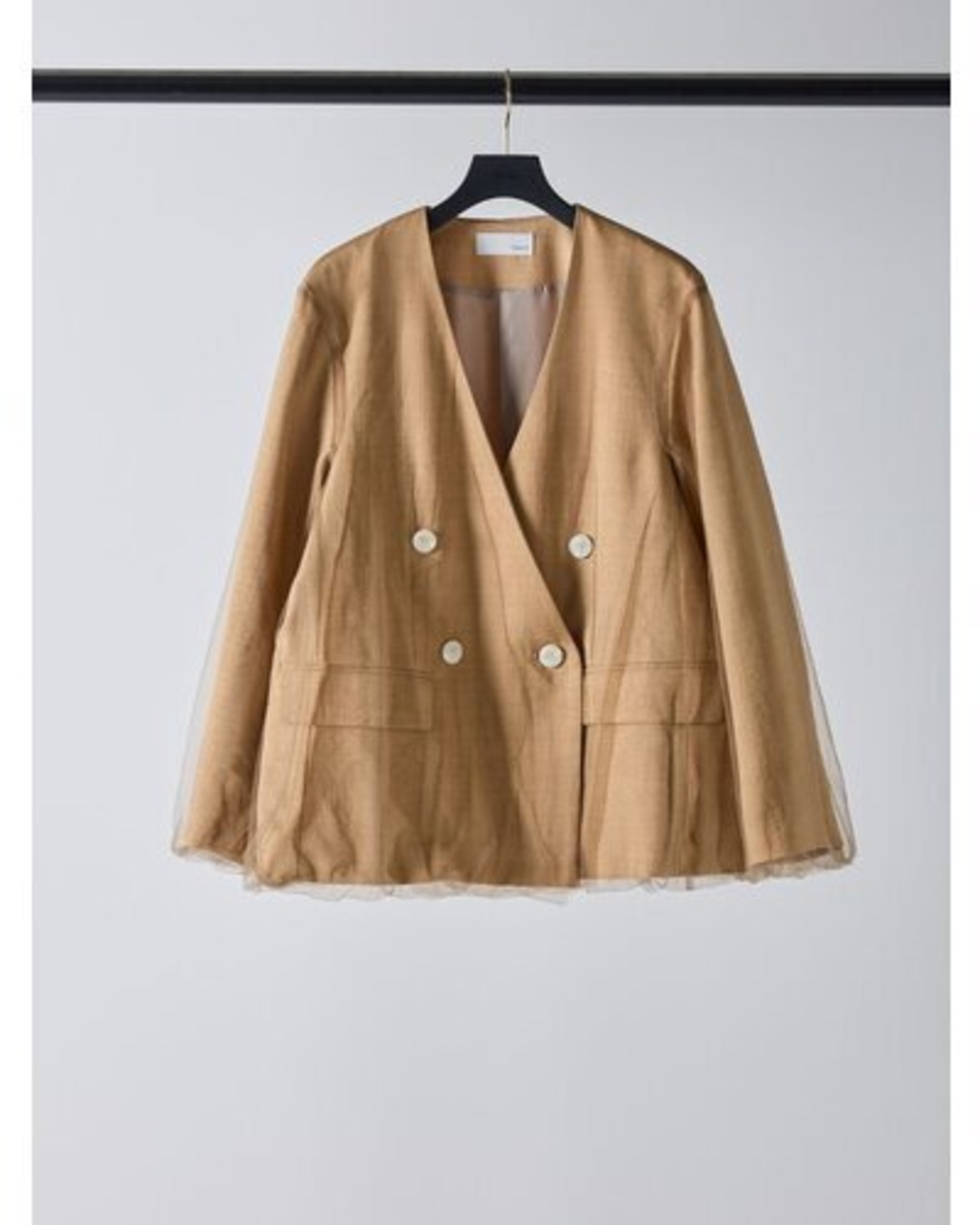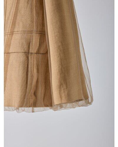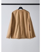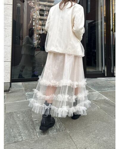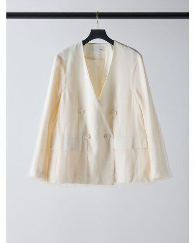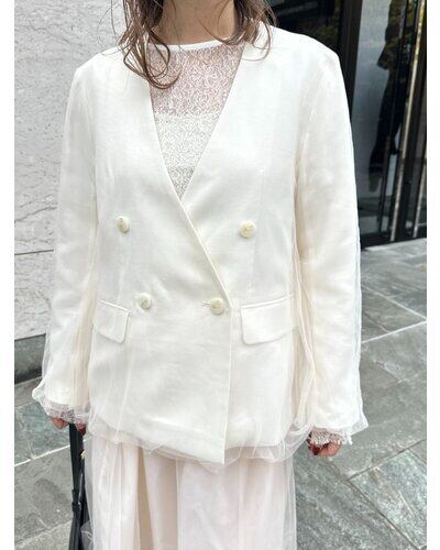 リネンライクな素材のノーカラージャケットに、ふわりとチュールを重ねた“春のはじまり”にぴったりな一着。