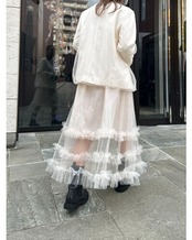 チュールにはボリュームを持たせてバルーン風に仕上げ、シアー感が動くたびに表情を変えるデザイン。