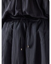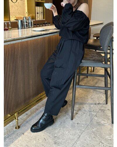 トップスとパンツで異なる素材を組み合わせた、1枚でスタイリングが完成するコンビネゾン。