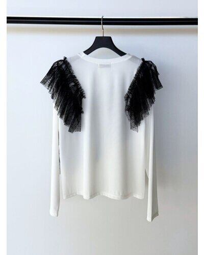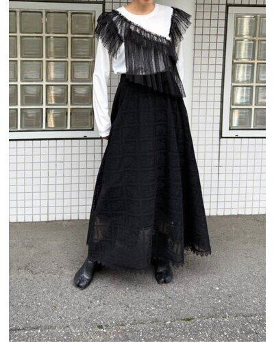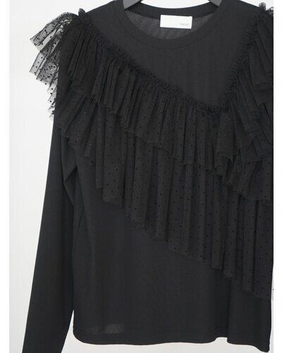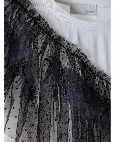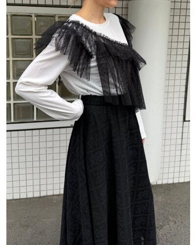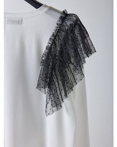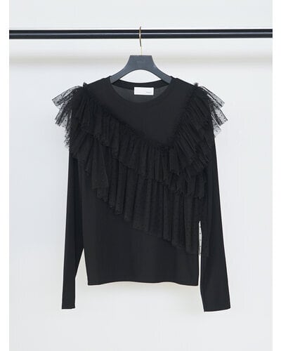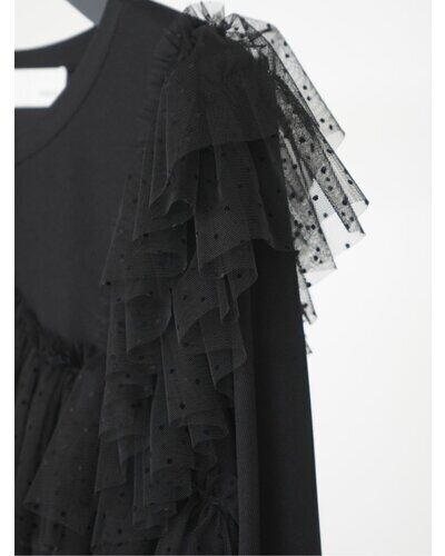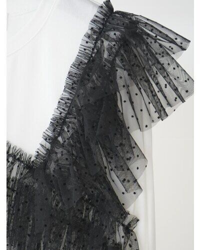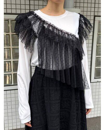 アシンメトリーにたっぷりと施したドットチュールフリルが華やかに揺れる、存在感抜群のドッキングトップス。