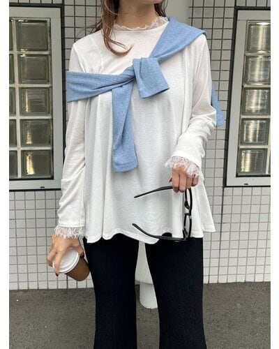 襟元と袖口にあしらった繊細なレースが、さりげなく女性らしさを添えるフレアトップス。