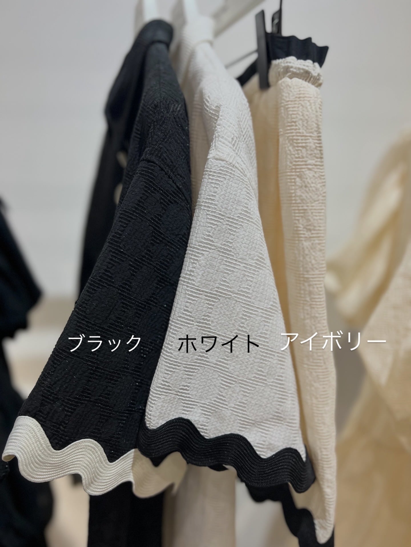 袖口と裾にウエーブしたテープを縫い付けて変化を付けました。フロントボタンはスナップで脱ぎ着しやすくなっています。ブラックは透け感があまりないので安心して着ることができました。陰影で出ているドットの柄も品良く、大好きなデザインになりました。