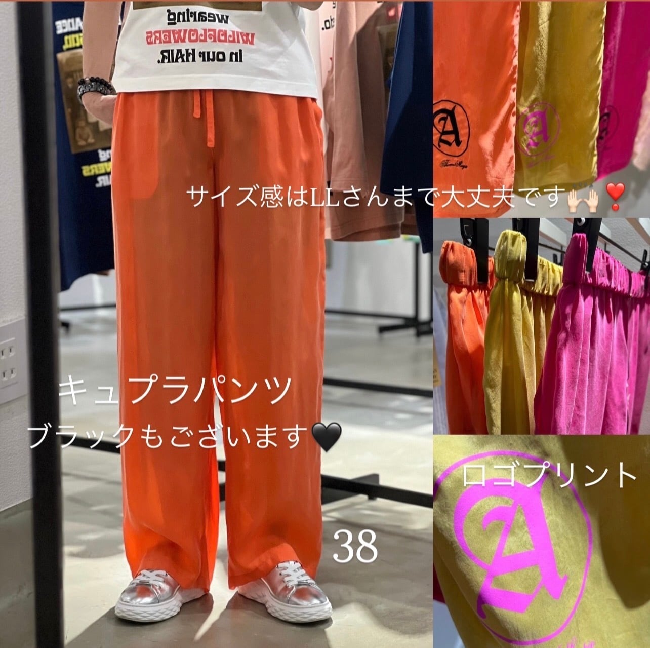 キュプラはとても涼しくて夏に万能な素材です。夏に着ていないかのような優しいタッチで履き心地がとても良いです。形はストレートのイージータイプでゴム+ドローストリングで幅広い体型の方に着ていただけます。丈はやや長め。38サイズより36サイズは3cm短めになります。155cm以下の方は36サイズ。それ以上の方は38サイズが目安です。