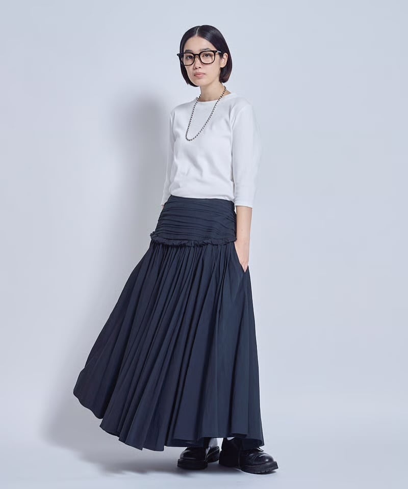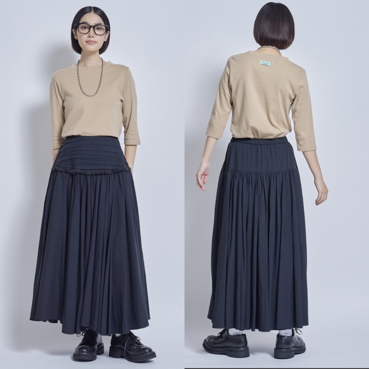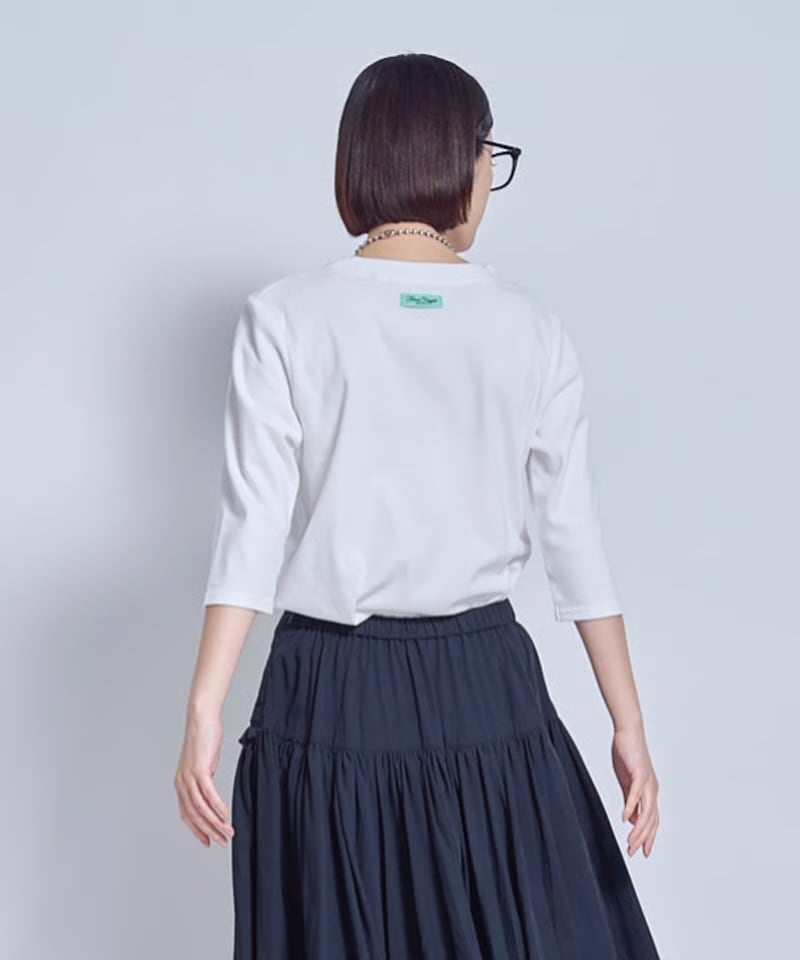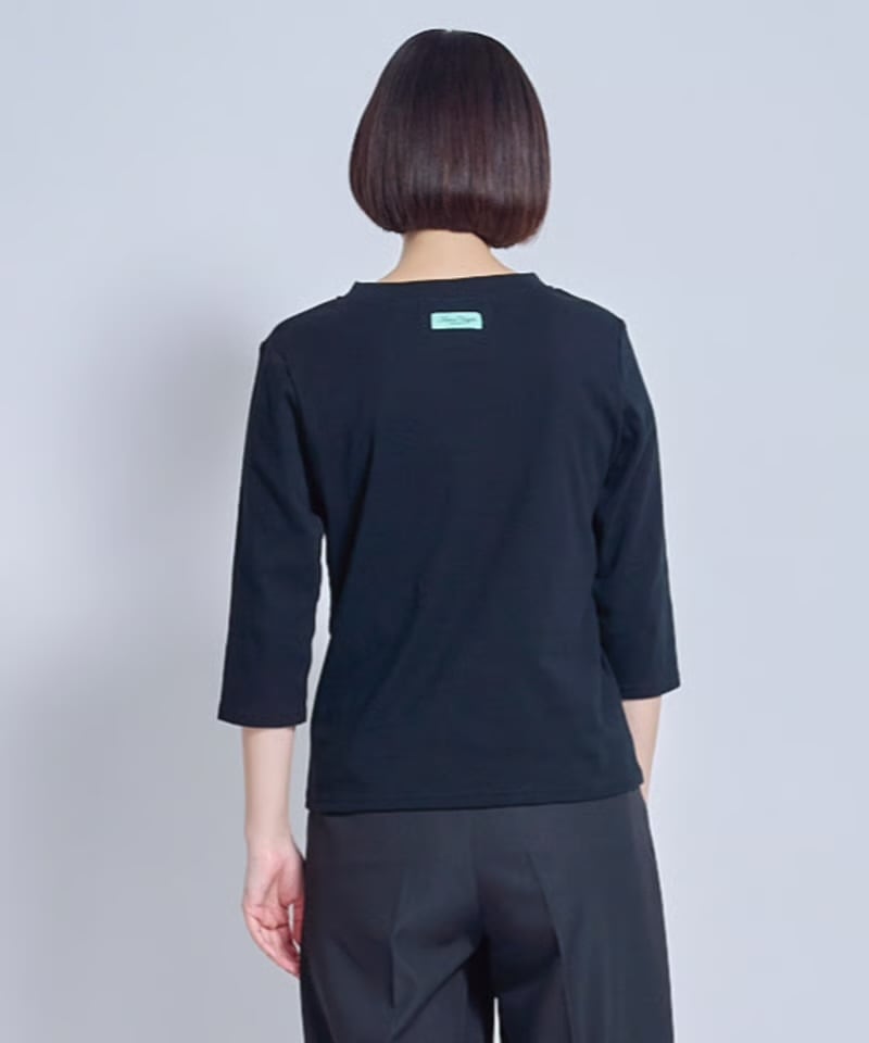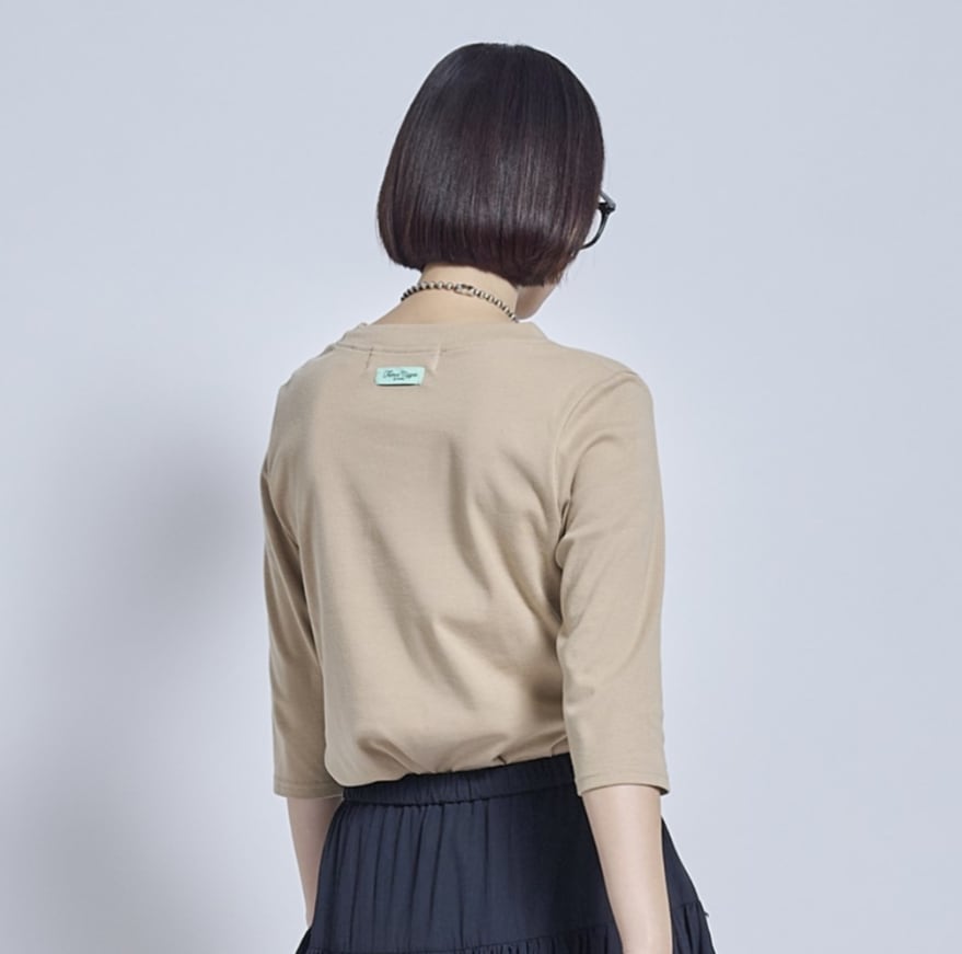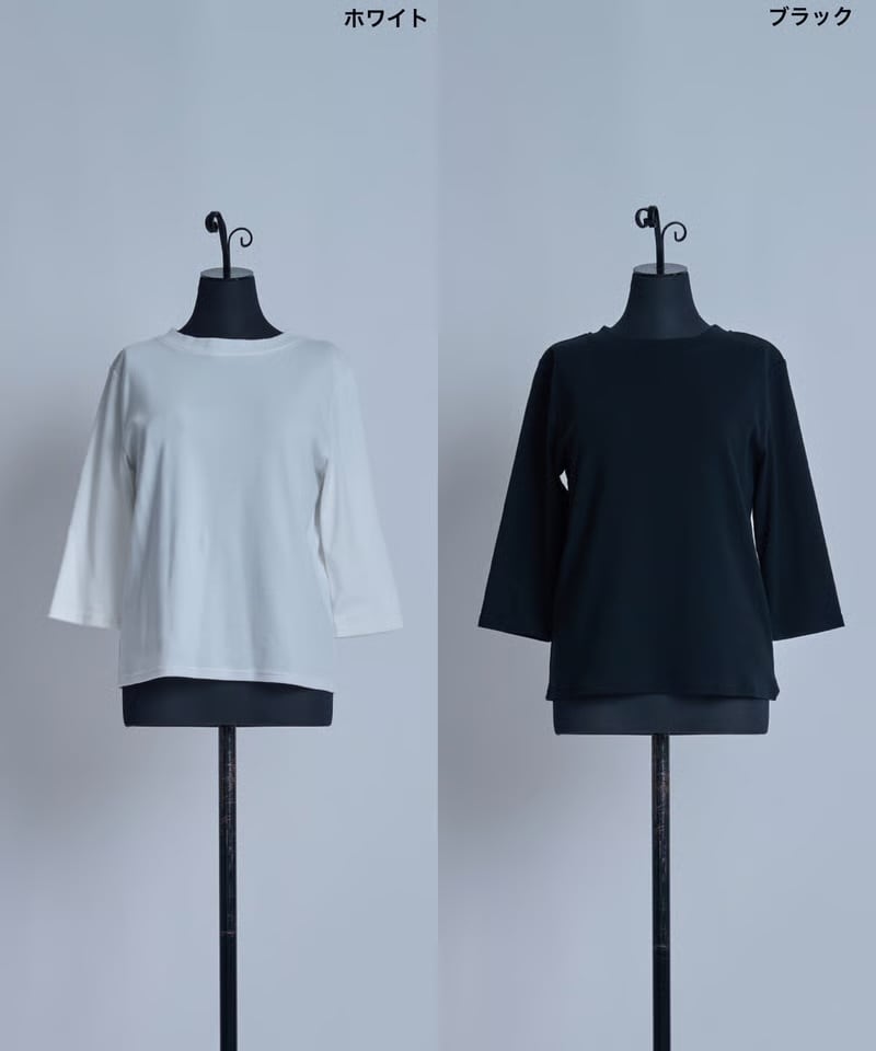 小さめに見えるシンプルなストレッチカットソーです。初めての形の新作。かなり肌触りの良いストレッチのミニカットソー。しかし、身頃は84cmと、割と身幅があり見た目ほど小さくは感じないとスタッフからのコメントがありました。たくさんのトップスを販売していますが、インナーに着られるタイト目に見えるカットソーが欲しいとの声が上がり、作ってみました。今回は以前出したストレッチ長袖カットソーよりも袖が短めで透け感がないのが特徴です。とにかくどんなウエアにも合わせやすく1枚持っていると、とても重宝します。特にサロペットや、ノースリーブなどのワンピースなどに使えて便利です。1枚での着用もすっきりしていて使いやすいと思います。袖が肘下あたりまでくるので、二の腕がとても細く見えます。肩線は入り込みすぎていないので、肩ハリさんにも気に入ってもらえると思います。