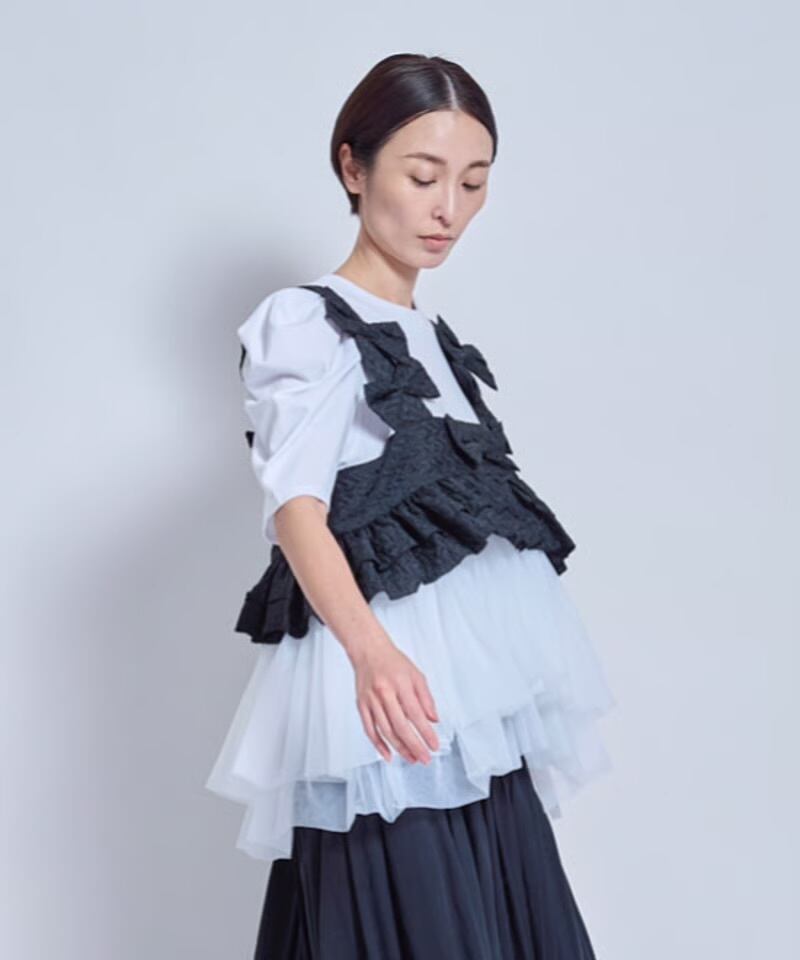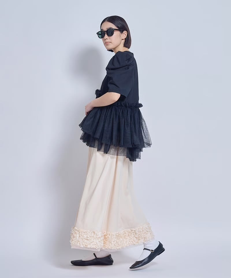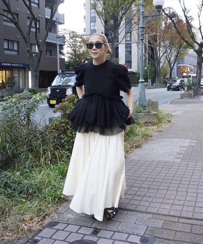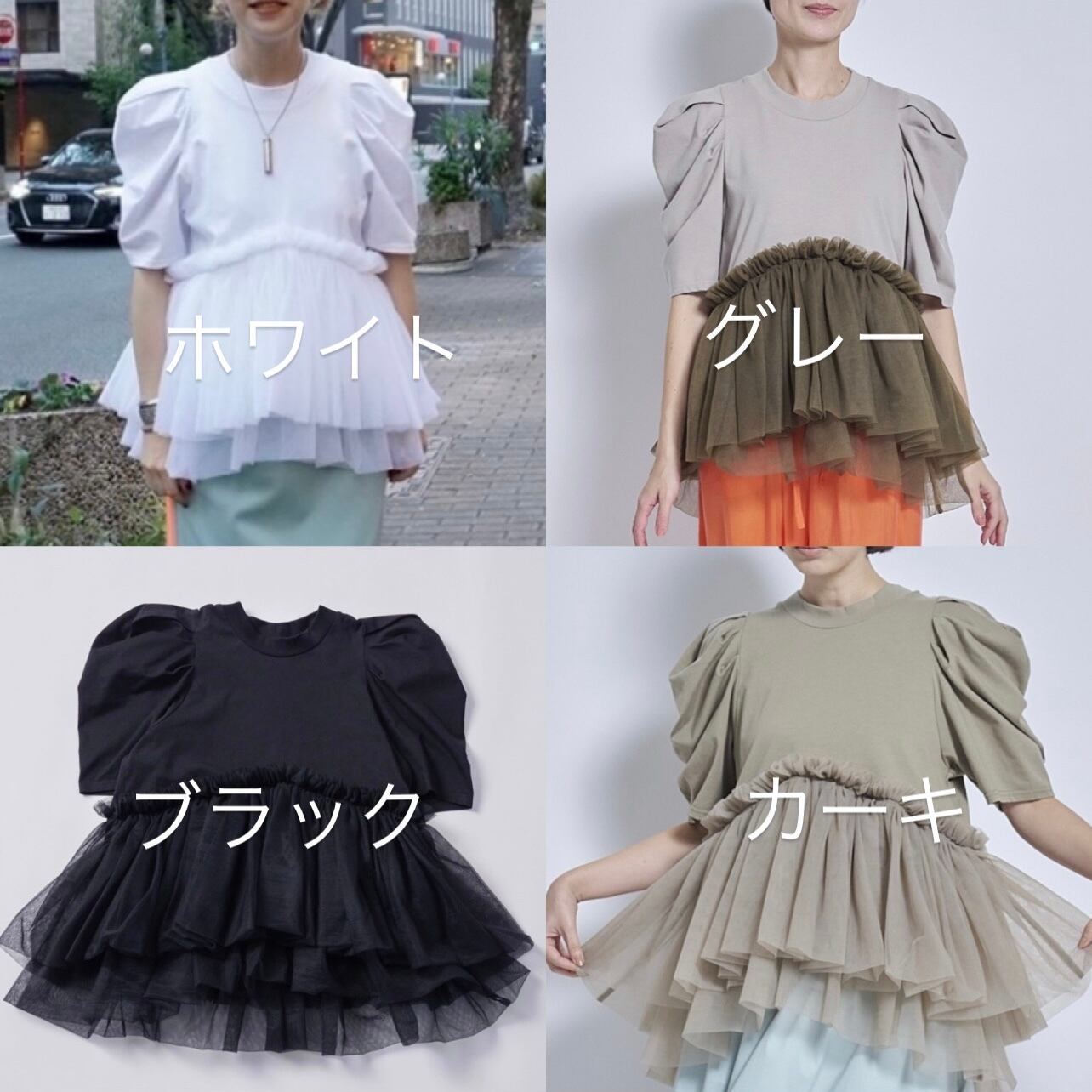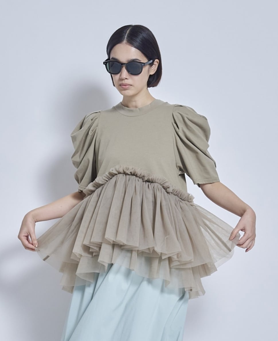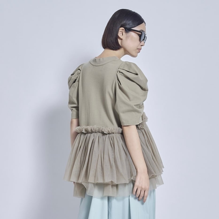 今回は胸下からチュールを重ねたインパクトのあるデザインに変更を加えてみました。身頃は94cmあり、かなり大きめ。肩が内側に入っていて、パフが飛び出していますが、肩ハリさんが、こぞって好んで色違いで購入していて、長年大ヒットの形になっています。胸下からチュールが2枚輪になってギャザーを寄せて付けています。お腹周りが気になる方、ヒップが隠れるので、ヒップ周りに生地がのっていると安心する方、カバーできて秀逸のデザインです。少し大袈裟なチュールですが、このボリューム感が非常にモードな雰囲気でとにかく気に入っています。