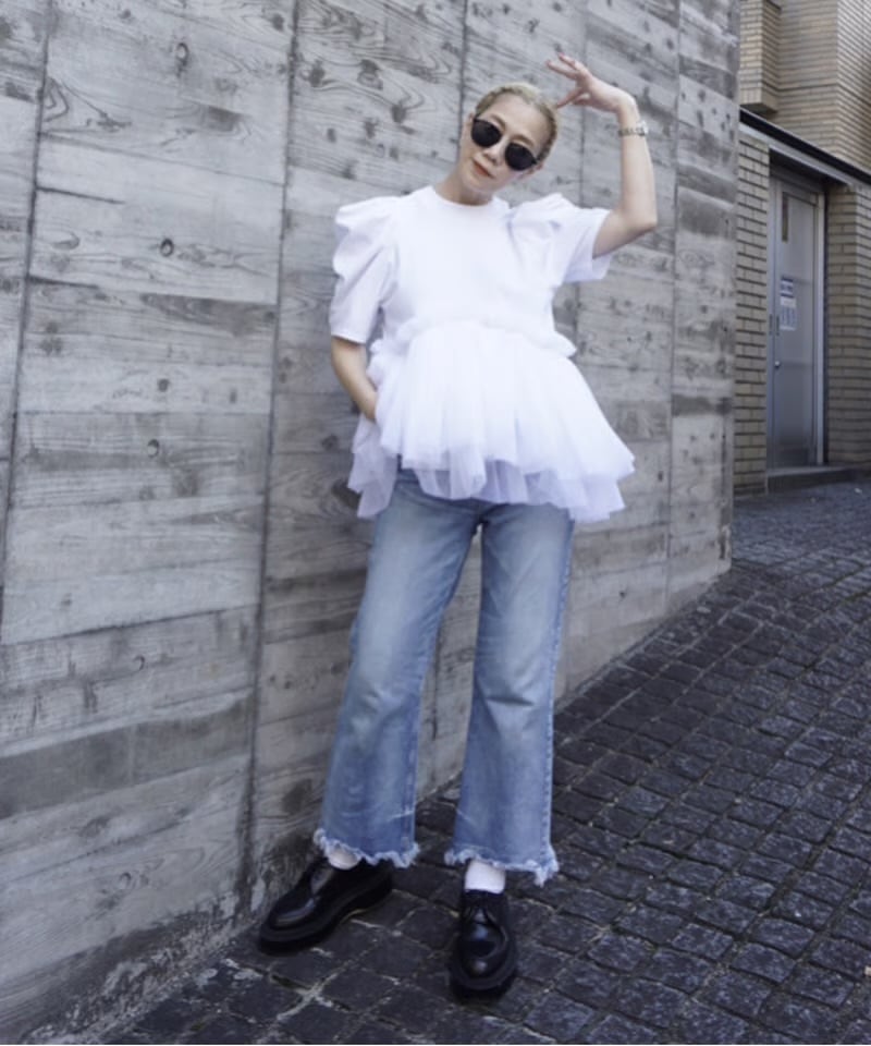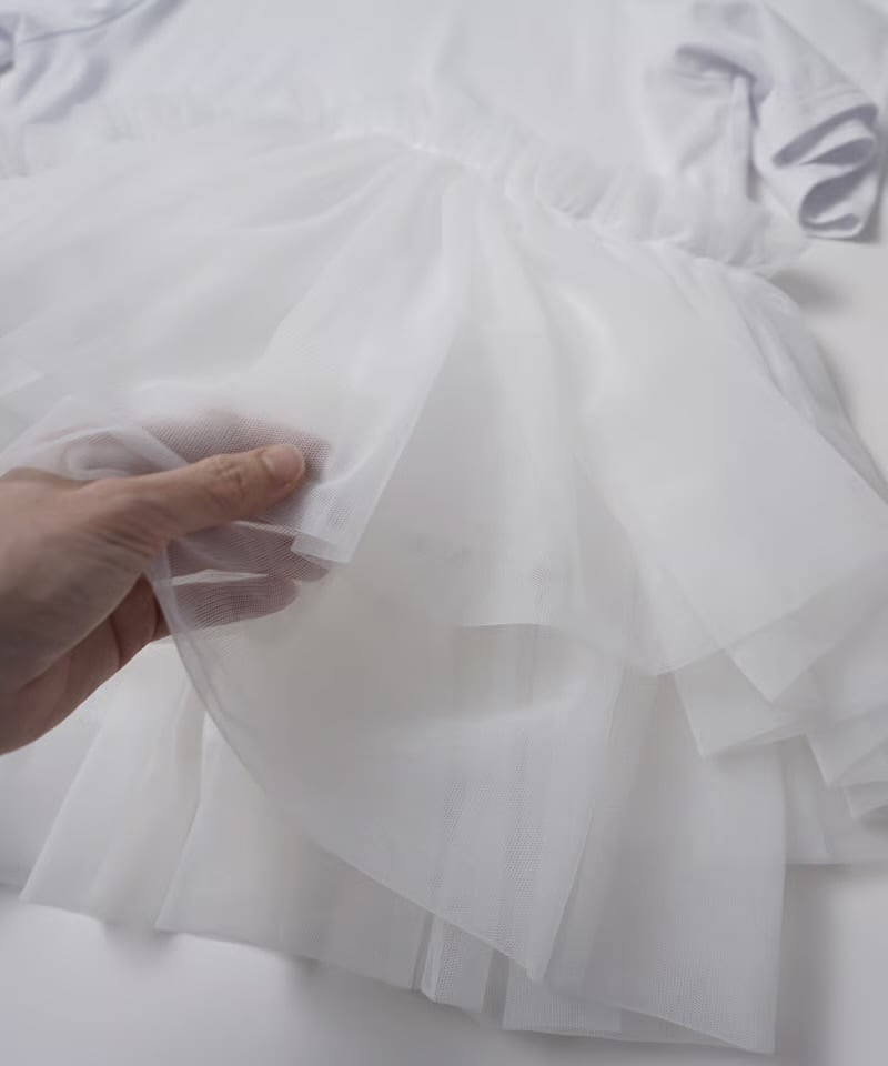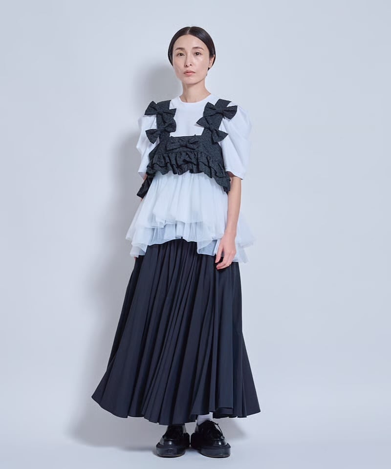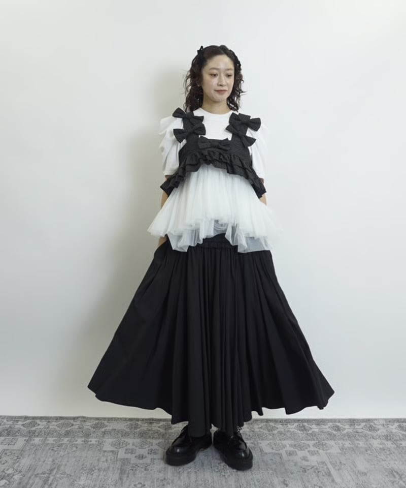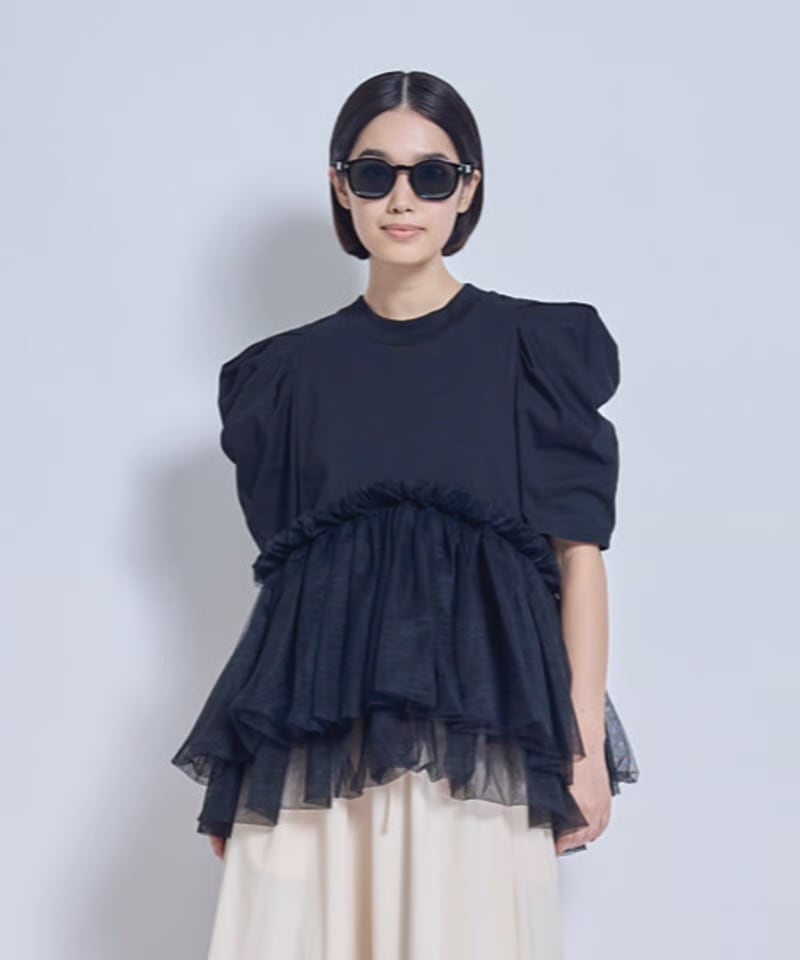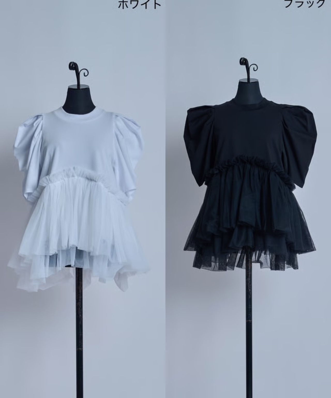 今回は胸下からチュールを重ねたインパクトのあるデザインに変更を加えてみました。身頃は94cmあり、かなり大きめ。肩が内側に入っていて、パフが飛び出していますが、肩ハリさんが、こぞって好んで色違いで購入していて、長年大ヒットの形になっています。胸下からチュールが2枚輪になってギャザーを寄せて付けています。お腹周りが気になる方、ヒップが隠れるので、ヒップ周りに生地がのっていると安心する方、カバーできて秀逸のデザインです。少し大袈裟なチュールですが、このボリューム感が非常にモードな雰囲気でとにかく気に入っています。