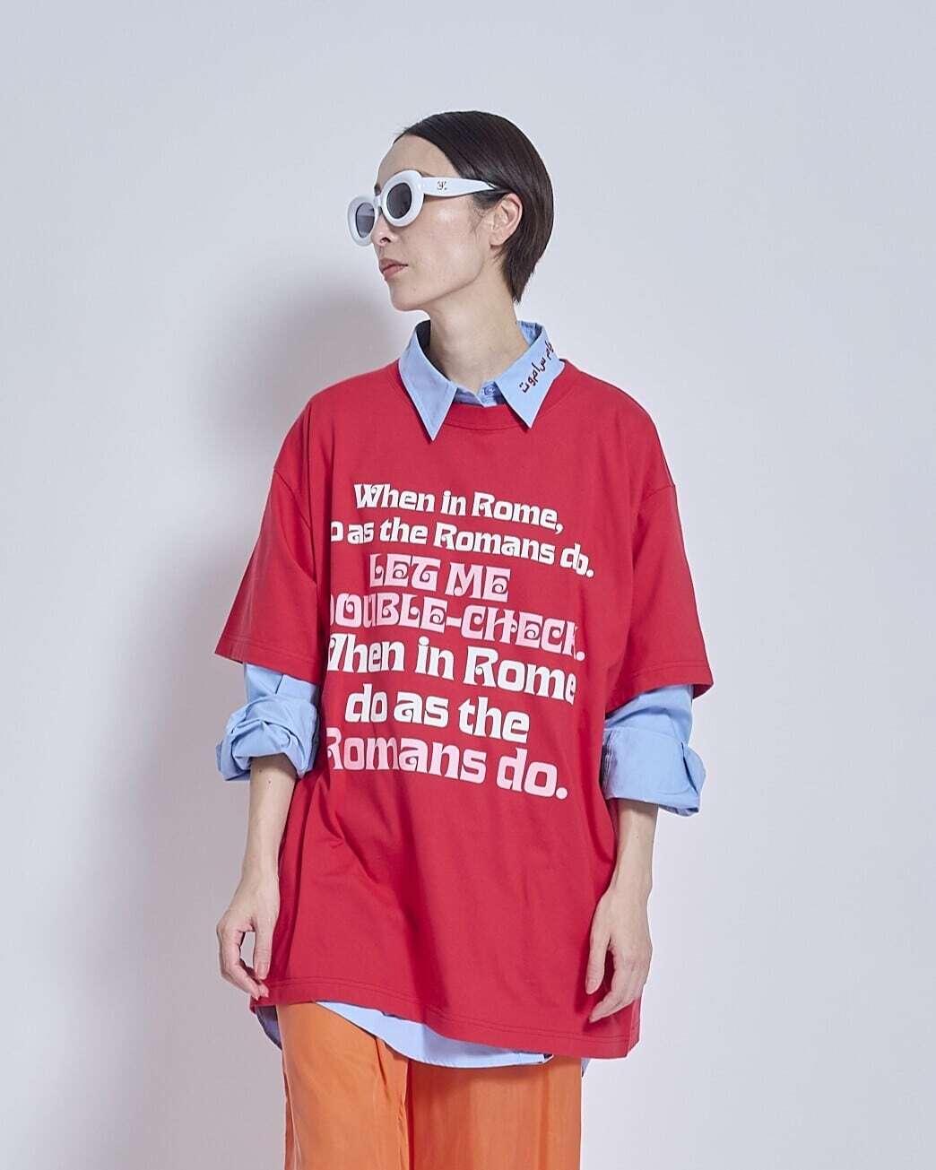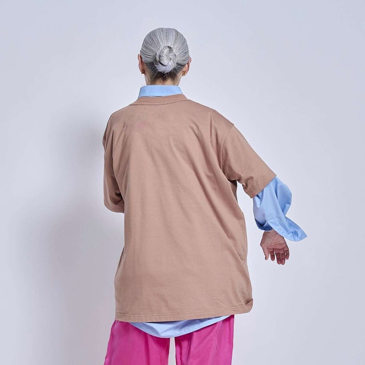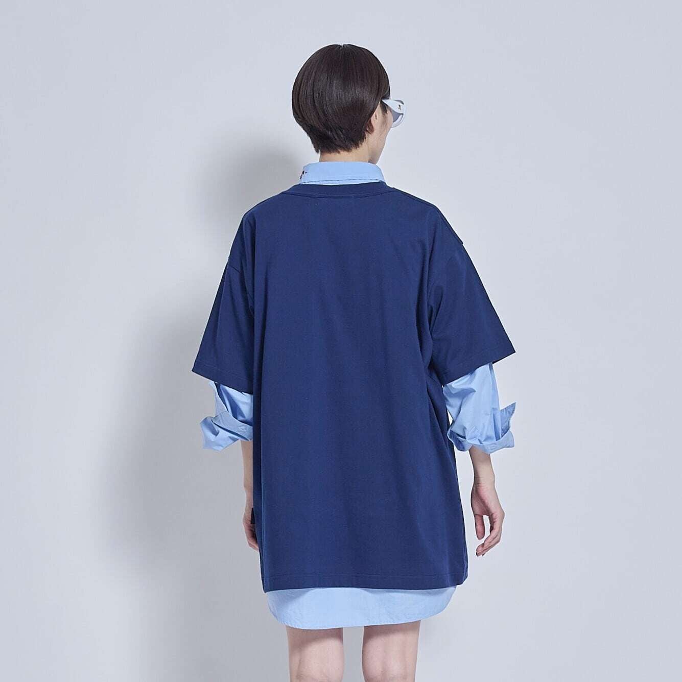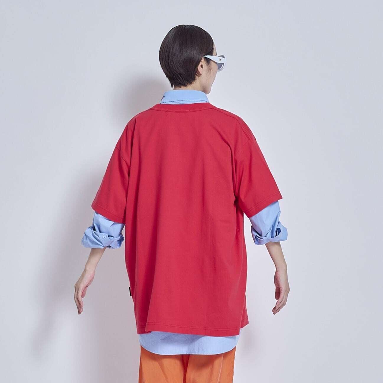 これまでにも大量の販売を行っている定番ビッグTシャツ。メンズのXLくらいのサイズ感で、180cmくらいの男性まで着ることができます。もちろん女性に大人気で、ずっと変わらず出しています。真夏のこのシーズンの展示会では毎年1000点以上のロゴTを販売していますが、リピーターがとても多いです。コットン100%のしっとりした肌触りです。しっかりしていて、長く愛用できて首周りの経年劣化が少ないです。