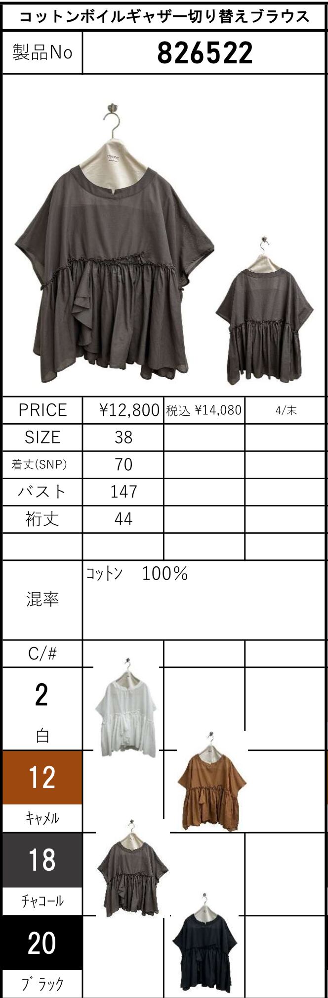 コットンボイルギャザー切り替えブラウス