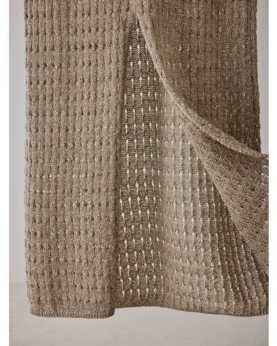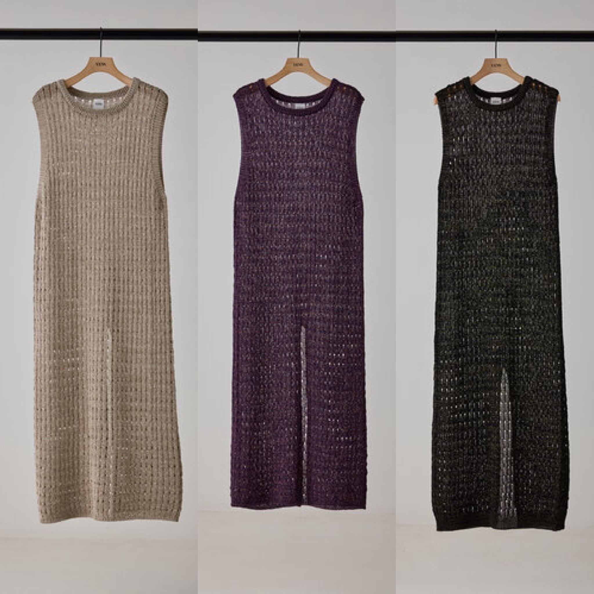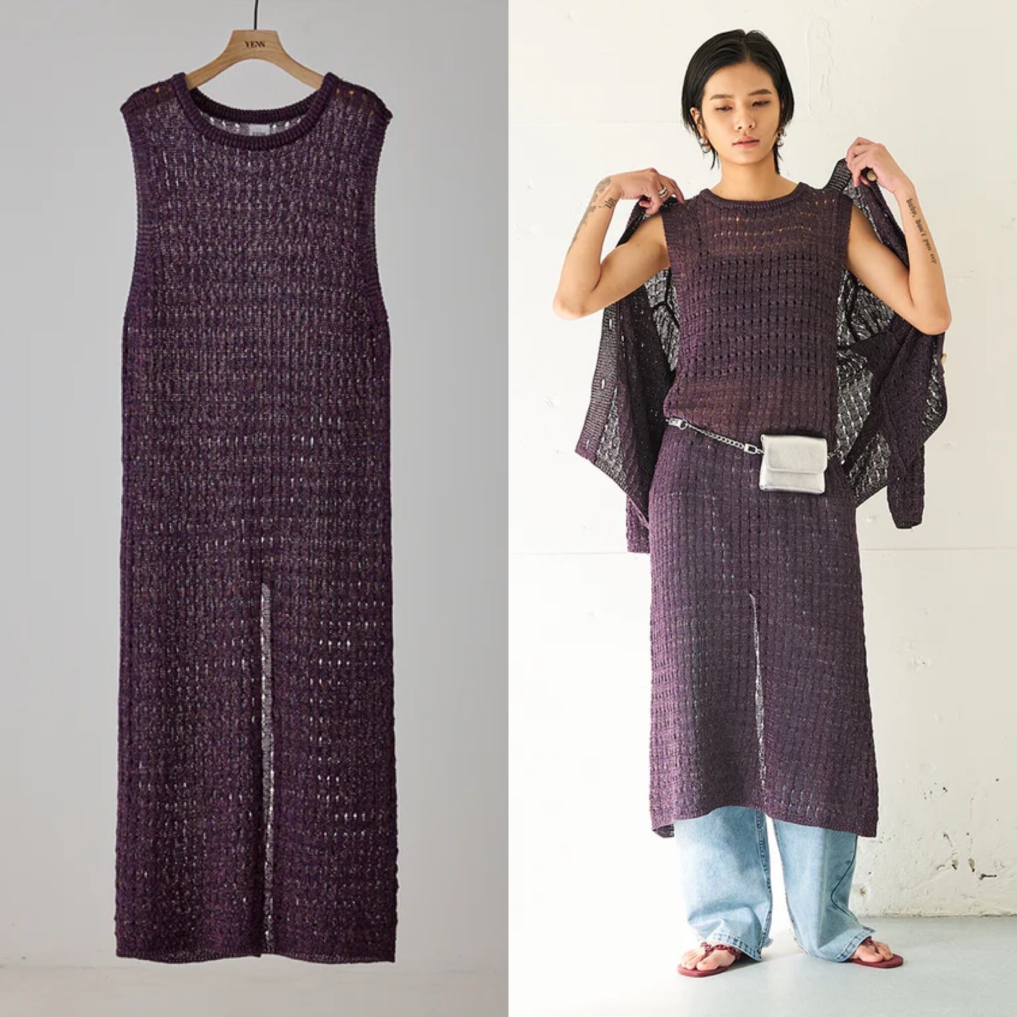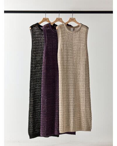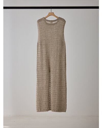 マニッシュな透かし編みを採用したニットロングワンピース。風合いの異なる2本の糸を引き揃えることで、独特なシャリ感と清涼感のある着心地に仕上げています。微配色の糸使いによる杢調の表情が、シンプルなデザインに奥行きをプラス。ノースリーブ仕様で軽やかに着用でき、バックスタイルの裾にはスリットを施し、動きやすさと抜け感を演出。パンツなどのボトムとレイヤードした着こなしも楽しめ、スタイリングの幅を広げてくれる一着です。