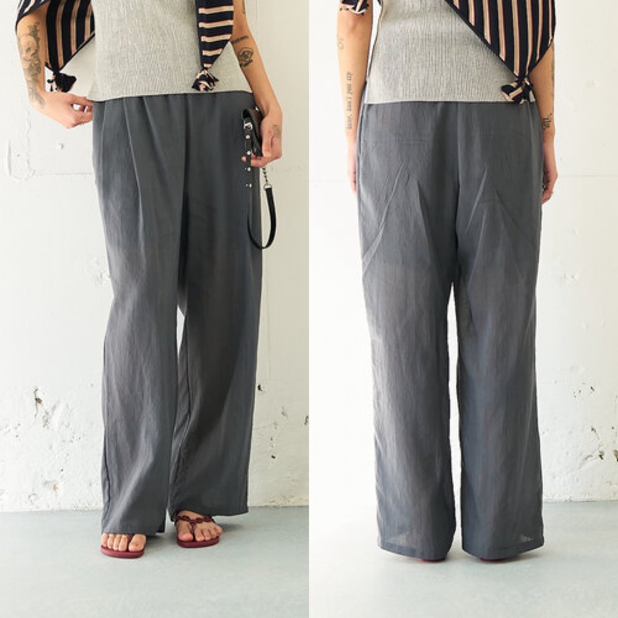 通常はブラウスで使用するような極薄の柔らかい素材をあえてパンツで採用。 真夏でもマニッシュな雰囲気のかっこよく着こなせるパンツに仕上げました。 とにかく薄くて軽いのがポイントです。 洗い加工と樹脂加工を施して、皴が多少目立たなくなるよう改良を重ねて作り上げた、シンプルながらも『こんなパンツが欲しい』ポイントを追求して作り上げました。