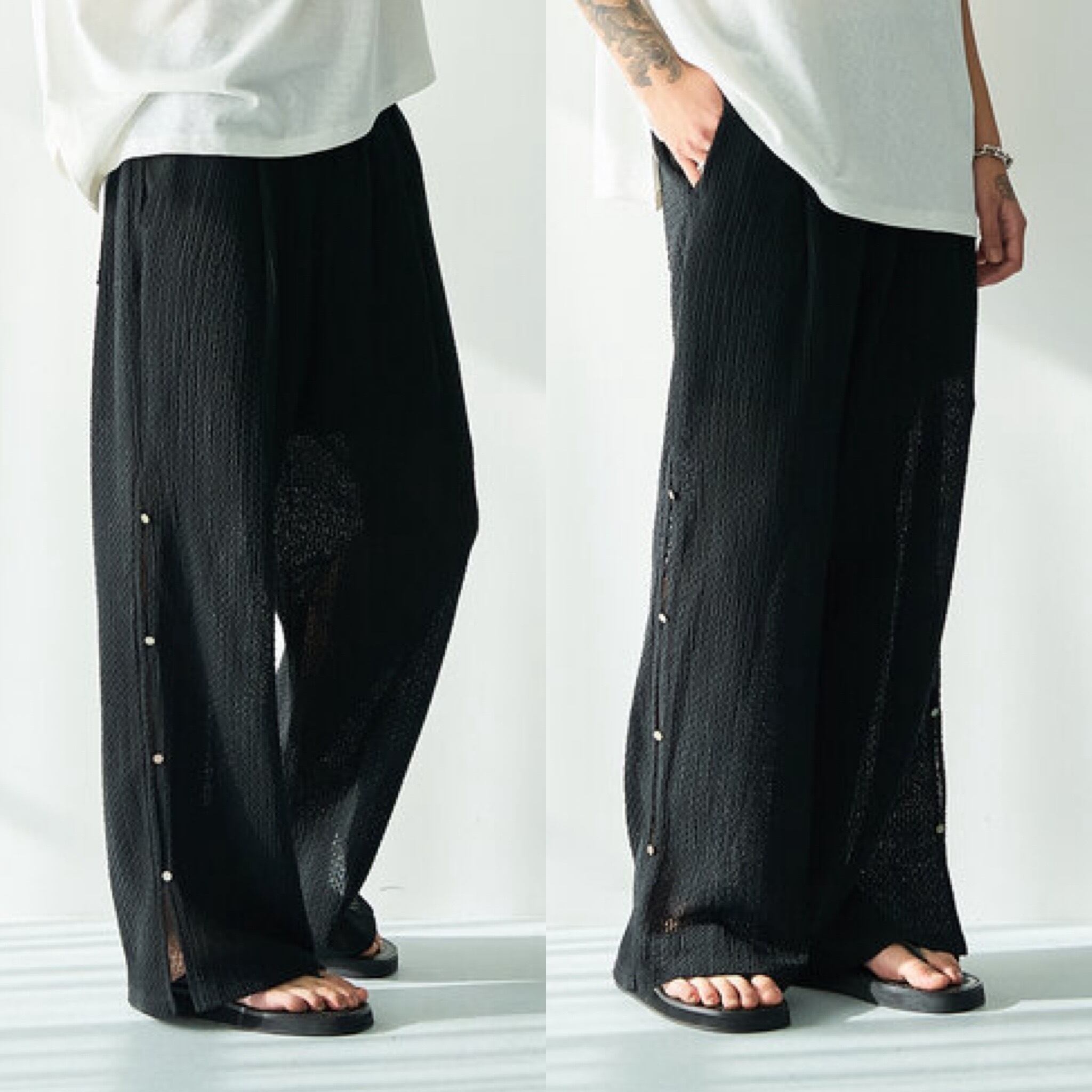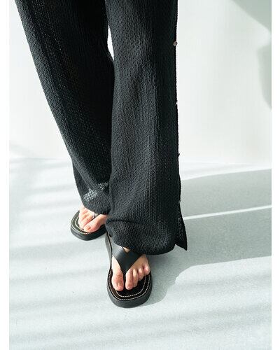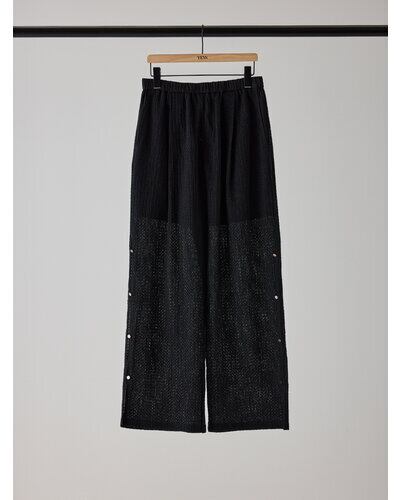 凹凸感のあるカットレース素材を使用した、表情豊かなパンツ。サイドに配したボタンディテールから、留め付けの間を通してさりげなく覗く肌が、上品で涼やかな印象を演出します。ややセミフレアのシルエットが自然なスタイルアップを叶え、動くたびに生まれる軽やかな肌見せが大人の余裕を感じさせます。ストレッチ性のあるレース素材に加え、ウエストベルトやポケット部分には別布を使用することで、デザインにメリハリを持たせた一着です。