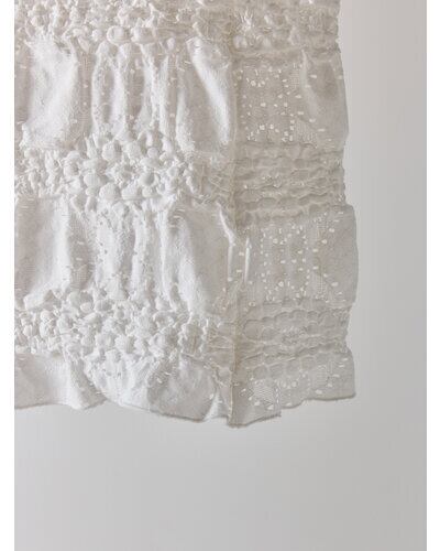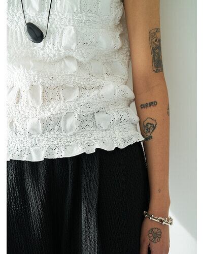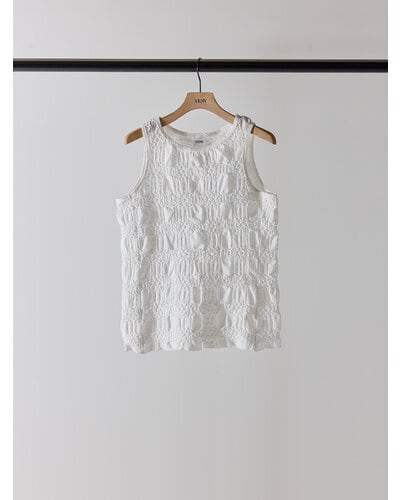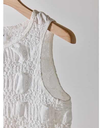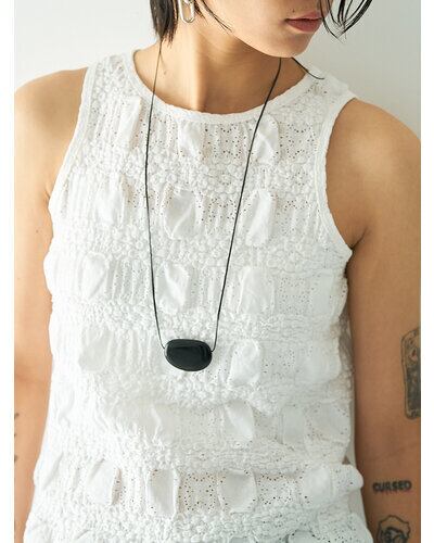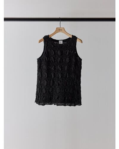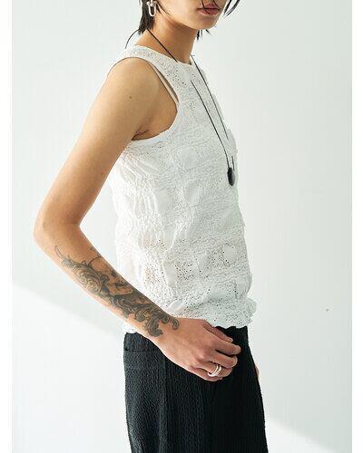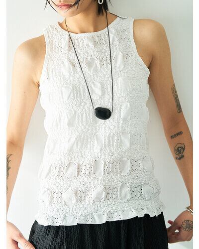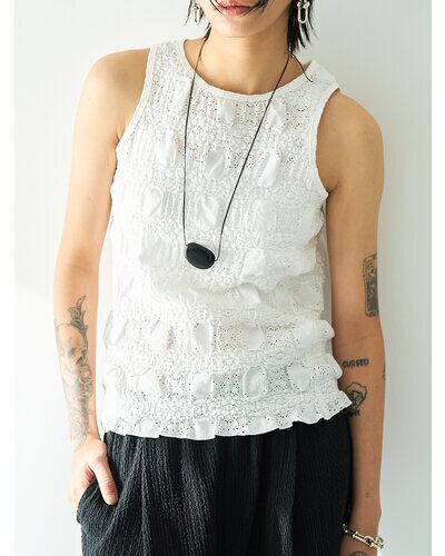 インパクトのある生地をシンプルなタンクトップに採用することで、甘くなりすぎないカジュアル好きな方に着ていただきたいレースアイテムに仕上げました。