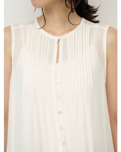 フロントとバックにピンタックをあしらい、すっきりとしたノースリーブ×ゆるやかなフレアシルエットで上半身を華奢に見せてくれます。