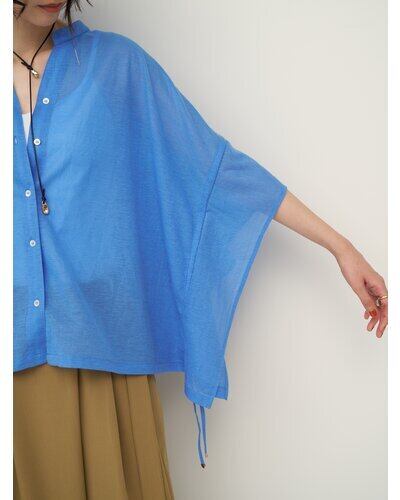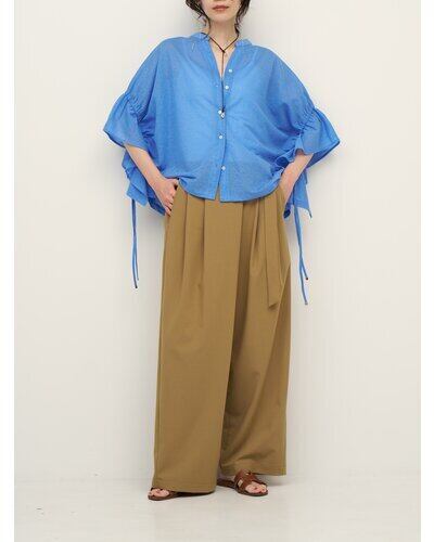 サイドの紐を絞って頂くと、ふらしている袖口部分ににフレアが入り、半袖のブラウスを着ているようなシルエットに変わります。