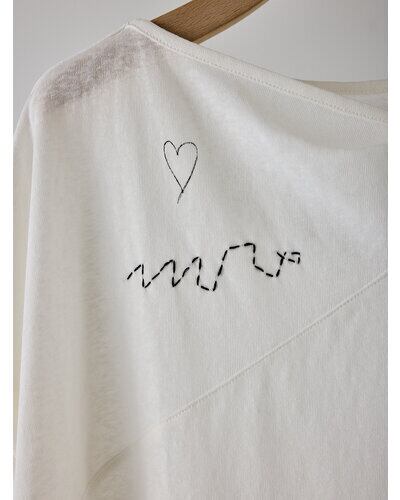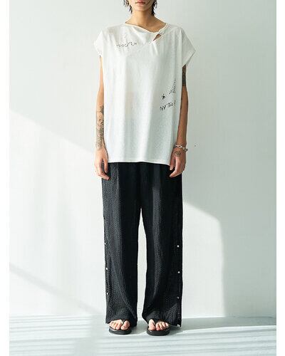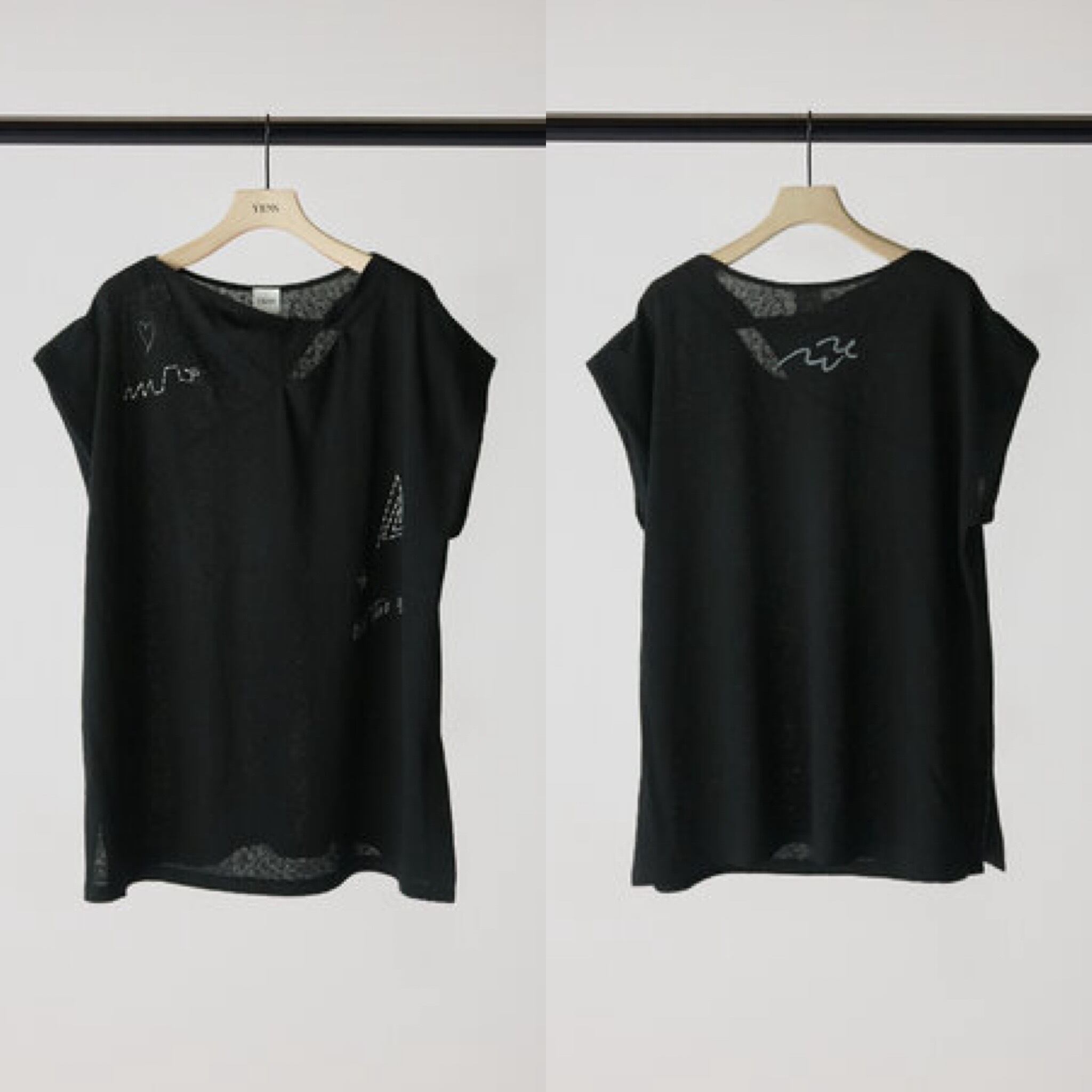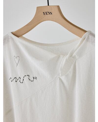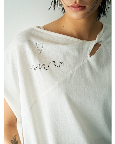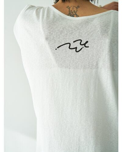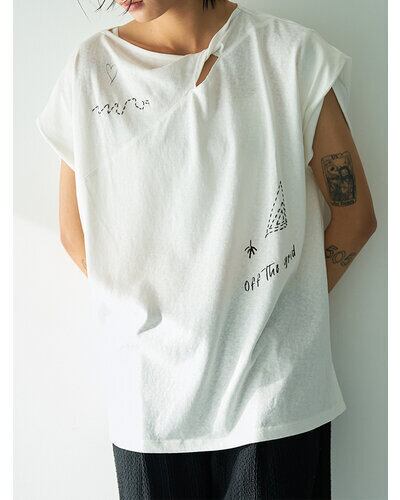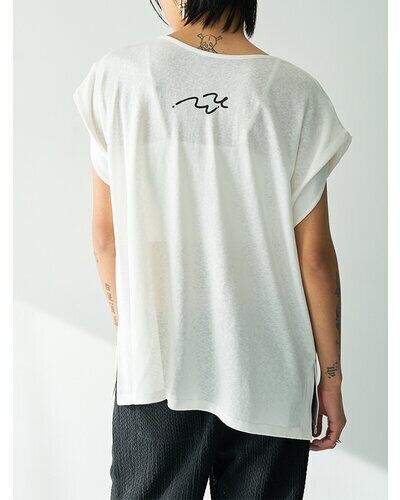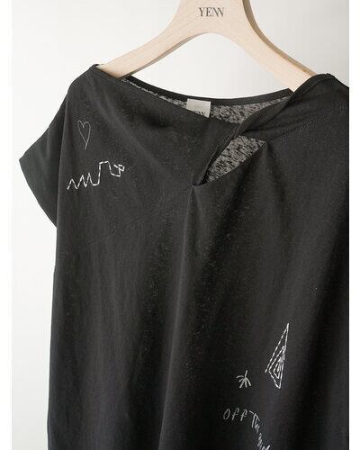 商品説明襟元に生地をツイストしたデザインを施し、さりげない肌見せを叶えるフレンチスリーブトップス。控えめに開いたネックラインが、大人らしい抜け感を演出します。袖口はややふんわりとした仕様で、女性らしい柔らかさをプラス。落書きのようにラフなプリントに、ハンドステッチ風の刺繍を重ねることで、贅沢感と程よい抜け感を併せ持つグラフィックに仕上げました。背中にはYENNのロゴをモチーフにしたプリントを施し、後ろ姿にも抜かりのないアクセントを。すっきりとしたシルエットのパンツと合わせるだけでなく、両脇のベンツ開きを活かしてフロントのみボトムインするなど、幅広いスタイリングが楽しめる一着です。