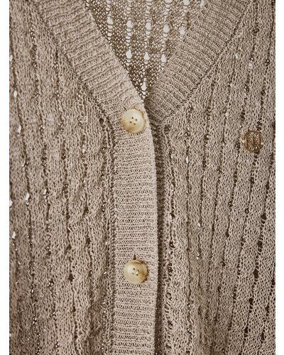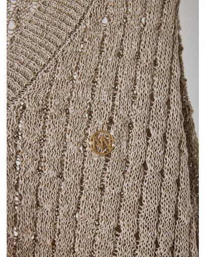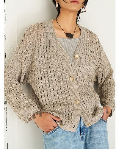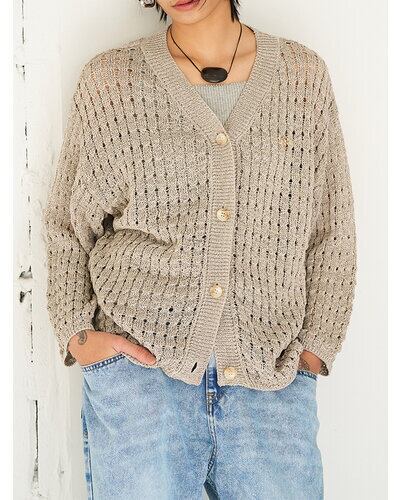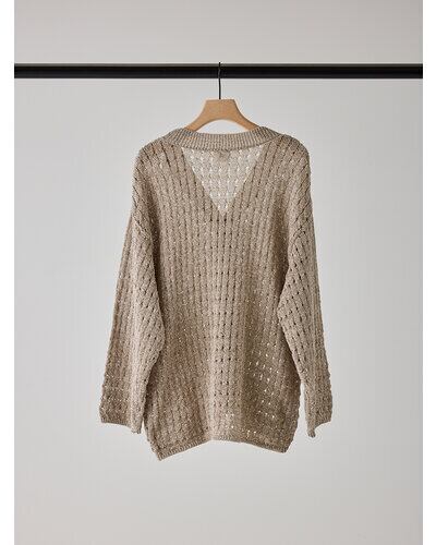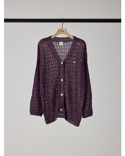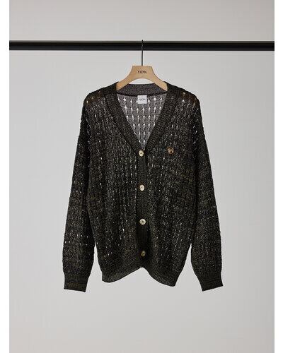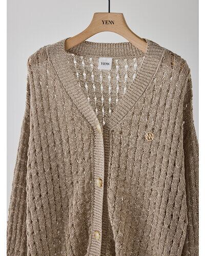 マニッシュな透かし編みを採用したニットカーディガン。風合いの異なる2本の糸を引き揃えることで、独特なシャリ感と清涼感のある着心地を実現しました。微配色の糸使いにより、杢調の奥行きある表情が生まれ、シンプルながら存在感のある一枚に。あえて9分丈に設定した袖丈は、腰巻きや肩掛けなどアレンジもしやすく、スタイリングの幅を広げてくれます。胸元にはYENNの金属チャームをあしらい、さりげなく価値観を高めた仕上がりです。