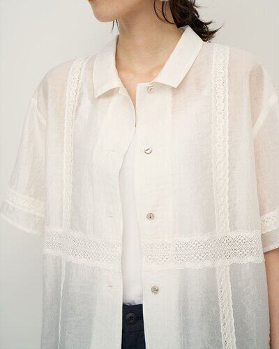 落ち感のある柔らかな素材に、繊細なレースをたっぷり施すことで、カジュアルなシャツアイテムでありながら上品な印象に。コンパクトなサイズ感なので、羽織りとしてはもちろん、1枚で着てもスタイリングがすっきりまとまります。