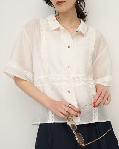 開襟シャツ風のデザインに、贅沢にレースをあしらったレースミックスシャツ。コンパクトな丈感と、ほどよくルーズなシルエットのバランスが絶妙で、女性らしい抜け感を楽しめる1枚です。