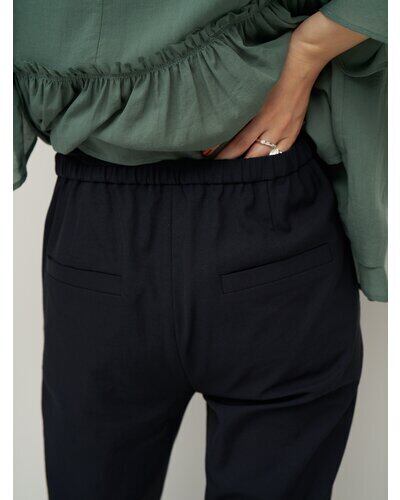 前ウエストにはギャザーを入れず、後ウエストのみにゴムを使用し、よりすっきりとしたシルエットに。